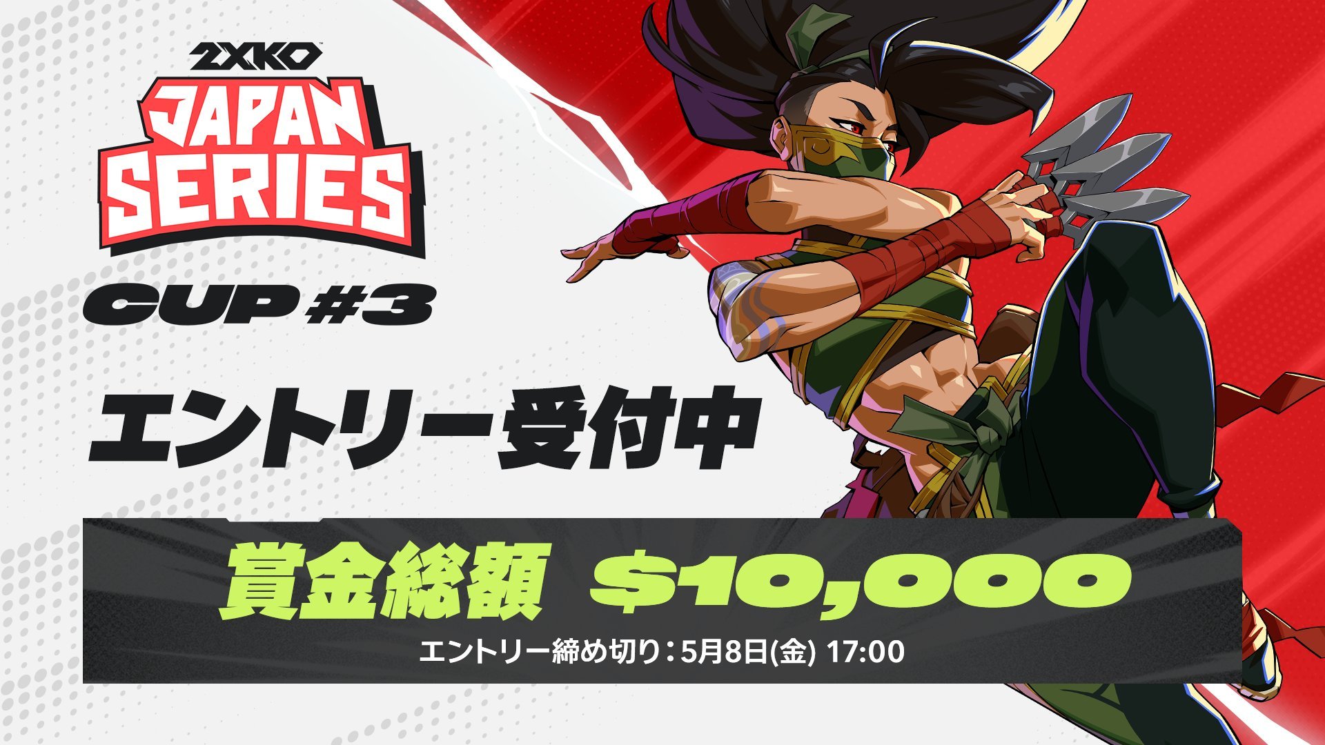 - 大会概要 【ゲームタイトル】 2XKO【概要】 「2XKO JAPAN SERIES(2XJS)」は、ライアットゲームズが主催する日本地域限定の公式大会シリーズ。年間を通して全8回の「Cup」と、「Summer Finals」「Winter Finals」の2つの主要大会で構成されており、「Summer Finals」にはCup#1〜#4の優勝者・Cup Points Ranking上位12名、招待者4名が出場できる。同様に、「Winter Finals」はCup#5〜#8が対象となる。各「Cup」は、誰でも参加可能なオンラインの「Open Qualifier」と、オフラインの「Top 8」が行われる。「Cup #3」は2026年5月9日(土)に「Open Qualifier」、5月16日(土)に「オフライン決勝(Top 8)」を実施する。会場 【会場】Open Qualifier:オンラインTop 8:Red Bull Gaming Sphere Tokyo(東京都中野区中野3丁目33−18 フェルテ中野 B1F)日程 【日程】Open Qualifier:2026年5月9日(土)Top 8:2026年5月16日(土)開場:13:00 開演:14:00 終演:20:00 予定賞金 各Cup:総額1万ドル(約150万円)※1ドル=150円換算エントリー情報 【エントリー条件】 ・日本国内在住のプレーヤー ・大会参加日に16歳以上であること(18歳未満のプレーヤーがオフライン決勝に進出した場合、保護者の同意書が必要)【エントリー〆切】2026年5月8日(金)17:00【エントリーURL】https://www.start.gg/tournament/2xko-japan-series-cup-3/detailsチケット情報 【チケット種類】オフライン決勝 会場観戦【チケット料金】無料【申し込みURL】https://docs.google.com/forms/d/e/1FAIpQLSfjmZC_iRAqMYPYSXgL8Nw3zGFldaE1usDM_niZqoS_iOnwYQ/viewform【申し込み〆切】2026年5月15日(金)23:59 までリンク 【配信】YouTube:https://youtube.com/@2XKOjpTwitch:https://twitch.tv/2xkojp【リンク】start.ggページ:https://www.start.gg/tournament/2xko-japan-series-cup-2/details2XKO公式サイト:https://2xko.riotgames.com/2XKO Japan 公式X:https://twitter.com/2XKOJP