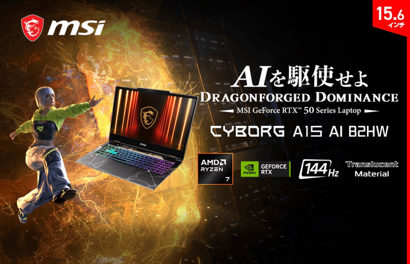 - アプライドオリジナルモデル「Cyborg-A15-AI-B2HWFKG-5554JP」が、2026年4月18日(土)より順次発売中。参考価格は239,800円。スタイリッシュなスケルトンデザインの筐体に、「NVIDIA® GeForce RTX™ 5060 Laptop GPU」と「AMD Ryzen™ 7 260」を搭載。15.6インチの144Hzディスプレーを備え、FPSやアクションゲームなどの動きの速いタイトルも滑らかな映像で楽しめる。 <以下、ニュースリリースより> スタイリッシュなスケルトンデザインの本体にRyzen 7とRTX 5060を搭載 アプライドオリジナルモデル「Cyborg-A15-AI-B2HWFKG-5554JP」発売 この度、エムエスアイコンピュータージャパン株式会社は、スタイリッシュなスケルトンデザインの本体に「NVIDIA® GeForce RTX™ 50シリーズ Laptop GPU」を搭載したゲーミングノートPC「Cyborg」シリーズよりの15.6インチ・144Hzディスプレー、Ryzen 7、RTX 5060を搭載したアプライドオリジナルモデル「Cyborg-A15-AI-B2HWFKG-5554JP」を2026年4月18日(土)より順次販売開始いたします。 「Cyborg」シリーズは、高速駆動の滑らか表示ディスプレーと高い冷却性能を併せ持つゲーミングノートPCで、ゲームプレーはもちろん、クリエイティブ用途や日常利用まで幅広く対応する万能モデルです。 初心者から中級者のゲーマー、学生・社会人まで「性能 × デザイン × コストパフォーマンス」を求めるユーザーに最適な一台です。Cyborg A15 AI B2HWの主な特徴 ●RTX 50 シリーズ搭載で最新ゲームも快適に楽しめるAIゲーミングノートPC 「Cyborg A15 AI B2HW シリーズ」は、筐体の一部にスケルトン素材を採用した近未来的なデザインを特長としています。15.6インチのフルHD(1,920×1,080)・144Hzディスプレーを搭載し、FPS・アクションゲームなど動きの速いゲームでも滑らかな映像を楽しめます。約2.2kgの堅牢なボディは持ち運びにも対応し、ゲーミングから日常用途まで幅広く活躍します。 CPU には「AMD Ryzen™ 7 260」を採用し、ゲームプレー、配信、動画編集など負荷の高い作業も快適にこなせます。GPUには「NVIDIA® GeForce RTX™ 5060 Laptop GPU」を搭載し、DLSS とレイトレーシングにより美麗な映像表現と高フレームレートを実現。メインストリームゲーミングノートPCとして高いコストパフォーマンスを誇ります。 USB3.2 Gen1 Type-C(映像出力/USB PD 対応)、USB3.2 Gen1 Type-A、HDMI™、さらに1Gbps 有線LAN を搭載。オンラインゲームで重要な安定した通信環境を確保でき、変換アダプタ不要で周辺機器の接続もスムーズです。 ・Cyborg A15 AI B2HW シリーズ製品ページ:https://jp.msi.com/Laptop/Cyborg-A15-B2HWXMSIについて MSIは世界を牽引するゲーミングブランドとして、ゲーミング業界とeSports業界から最も信頼されているPCメーカーです。 日本全国の各販売店でPC本体、PCパーツ、PC周辺機器をユーザーの皆様がご購入できるよう展開を行っており、特にゲーミングノートPCやゲーミングモニターといったゲーミング製品、また、グラフィックスカードやマザーボードといったPCパーツで多数ご好評をいただいております。最先端の革新的なテクノロジー、最高のパフォーマンス、最高のユーザーエクスペリエンスを実現するPC、PC周辺機器をユーザーの皆様へ提供することをMSIのミッションとし邁進しています。●All rights of the technical, pictures, text and other content published in this press release are reserved. Contents are subject to changes without prior notice.