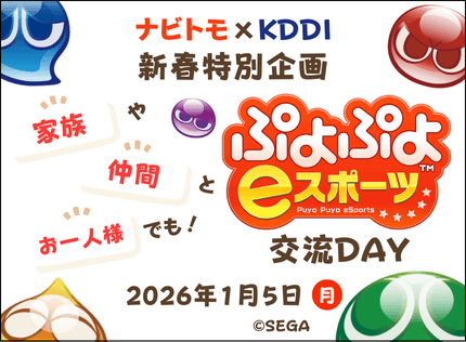 - 大会概要 【ゲームタイトル】 ぷよぷよeスポーツ【概要】 シニア向けコミュニティサイト「ナビトモ」を運営する松竹ブロードキャスティング株式会社が、eスポーツ施設esports Style UENOで開催するeスポーツ体験会。今回は、「冬休みの思い出作りや新年のチャレンジ」をテーマに、子どもから大人まで年齢問わず誰でも参加可能な新春特別企画として開催。飛車ちゅうプロによる『ぷよぷよeスポーツ』の初心者向け体験会のほか、抽選会や、併設するauショップのスタッフによる「スマホ相談会」を実施する。会場 【会場】 esports Style UENO(https://esports.au.com/)日程 【日程】 2026年1月5日(月) 午前の部:10:30〜12:00 午後の部:13:00〜14:30出演者 講師:飛車ちゅう(https://x.com/hisyachu)エントリー情報 【エントリー条件】 誰でも参加可能※未成年のみでの参加は不可【エントリー〆切】先着順(各部10名)【エントリー料金】 500円(税込、1ドリンク・抽選券付き) 同伴者は無料(ドリンク・抽選券なし)【エントリーURL】https://x.gd/59n5cリンク 【リンク】シニア向けコミュニティサイト「ナビトモ」イベント詳細ページ:https://www.navi-tomo.com/special/detail.php?id=86