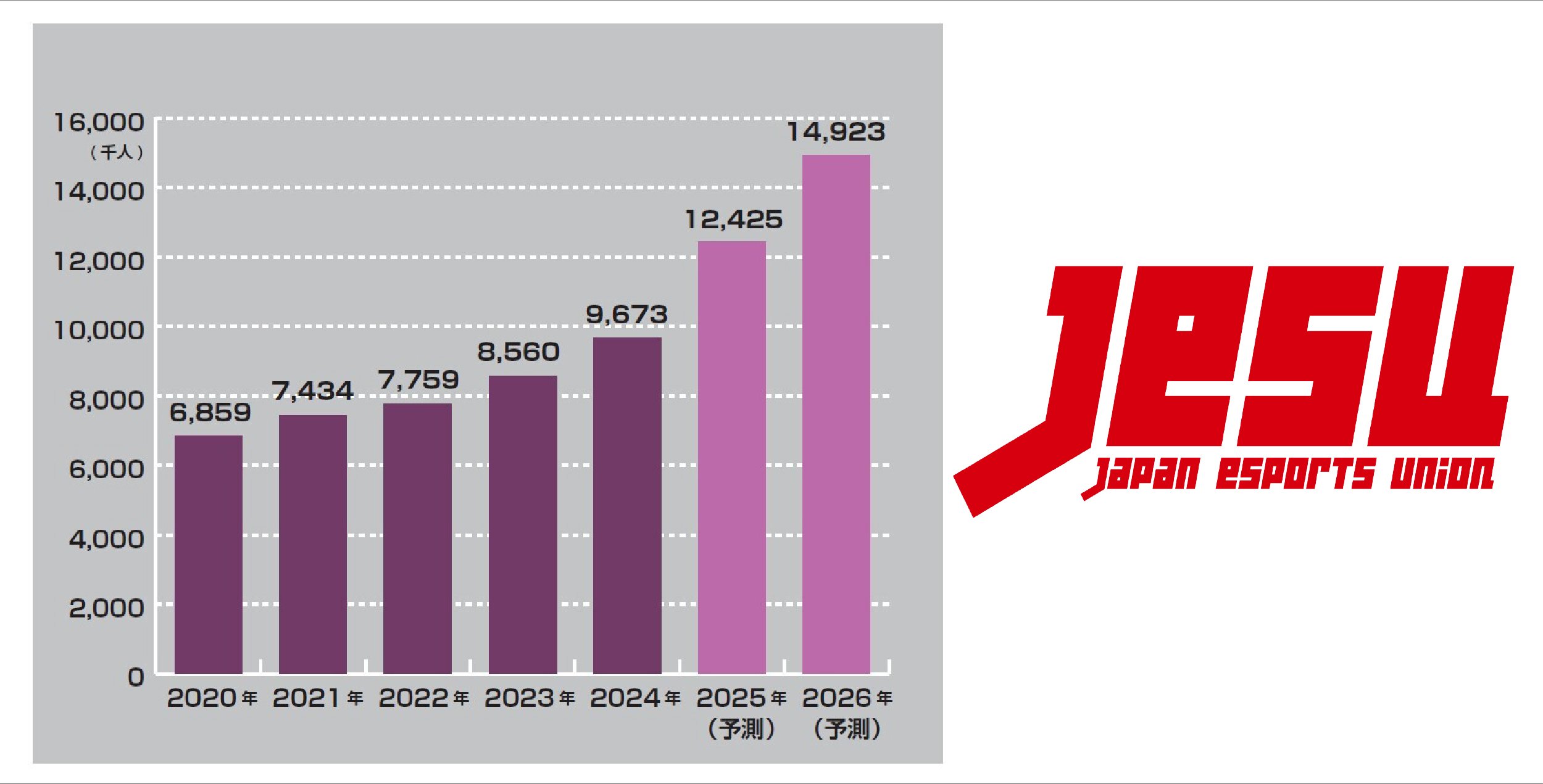 - 一般社団法人日本eスポーツ協会(JESU)は、国内eスポーツ業界のデータ年鑑「日本eスポーツ白書2025」を2026年3月26日(木)に発売した。2024年の日本国内eスポーツ市場規模は前年比9.9%増の推計約161億円で、2026年には200億円超と予測。eスポーツファン数は約967万人にのぼり、2026年には約1,500万人に迫ると見込まれている。 ゲームマーケティングサービス「f-ism(エフイズム)」にて99,000円(税・送料込)で販売中。 <以下、ニュースリリースより> データ年鑑『日本eスポーツ白書2025』発売 一般社団法人日本 eスポーツ協会(会長:早川英樹 以下、JESU)は、国内eスポーツ業界のデータ年鑑である「日本eスポーツ白書2025」を、3月26日(木)に発売します。 「日本eスポーツ白書」は、国内eスポーツ産業を最新データとともに解説し、インタビューやユーザー調査など、産業を多角的に展望できるさまざまな情報をとりまとめた網羅的な年鑑です。 JESUは、日本国内のeスポーツの普及と発展のため、大会等の興行だけでなく、地方創生や国際交流、教育、福祉など、幅広い領域における、eスポーツ利活用の推進を目的として「日本eスポーツ白書」を編纂し、2022年から刊行しています。 2024年の日本国内におけるeスポーツ市場規模は、前年対比で9.9%と伸長し、推計約161億円となりました。2020年以降、市場規模は年平均成長率10%前後で安定的に成長を続けており、2026年には200億円を超えると予測しています。 また、市場を構成する項目としては、オンラインとオフラインのハイブリッド開催が定着したイベント運営と、大会やチームに対するスポンサー費用が、それぞれ全体の35%以上を占めています。また、関連グッズやストリーミングに関しては高い成長率で伸長しており、今後産業内における存在感をいっそう増していくと考えられます。 日本eスポーツ市場規模の推移 2024年国内eスポーツ市場の割合 2024 年の日本eスポーツファン数(試合観戦、配信動画視聴経験者など)は、およそ967万人と推定されます。JESUは、アンケート調査の結果などから、その43.3%にあたる約419万人が、日本国内におけるeスポーツの競技者人口にあたると予測しています。また、今後国内外で開催される国際的なeスポーツ大会の影響もあり、2026年には日本のeスポーツファン数は約1,500 万人に迫ると予測しています。 日本のeスポーツファン数の推移 「日本eスポーツ白書2025」は、3月26日(木)より、ゲームマーケティングサービス「f-ism(エフイズム)」にて販売を開始します。(https://f-ism.net/report/nesh2025.html)JESUは今後も、日本におけるeスポーツの振興を通して国民の競技力の向上およびスポーツ精神の普及を目指し、これをもって国民の健康とともに、社会・経済の発展に寄与することを目的として活動していきます。「日本eスポーツ白書2025」 概要・価格: 99,000円(税/送料込)・発売日: 2026年3月26日(木)・ページ数: 322ページ・商品形態: PDFファイル(CD-ROMに収録)・発行: 一般社団法人日本eスポーツ協会・制作・販売: 株式会社角川アスキー総合研究所第1 章 パースペクティブ (インタビュー/寄稿)eスポーツが拓くアジアの平和と未来へのレガシー (公益財団法人 愛知・名古屋アジア・アジアパラ競技大会組織委員会 事務総長 村手 聡) サウジアラビアの未来を掴む術 (在サウジアラビア日本国大使館 経済班長 楠田 真之) 「興行」から「文化」へ セガが描くeスポーツの普及と教育的価値の創出 (株式会社セガ グローバルeスポーツ推進部) 「ALGS」連続誘致で札幌市が目論むeスポーツとゲーム産業活用による地域活性化 (札幌市 スポーツ局 スポーツ都市推進課長 枝元 俊晴) 第2 章 eスポーツ市場動向eスポーツ市場データ2024 【補足】2024 年 ゲーム全体のマーケット動向 eスポーツ関連のニュース一覧 (2022 年1 月〜2025 年12 月) 主なeスポーツの大会 (国内リーグ・大会/総合大会/企業主催大会/チーム・ストリーマー主催大会、コミュニティ大会/国際大会) 主なeスポーツチームとスポンサー 第3 章 ユーザー調査大規模WEB 調査による「eスポーツ」に関するユーザー・マーケティング・リサーチ (調査概要/認知度/情報取得メディア/接触/職業・教育/今後の意向/タイトル認知・接触/タイトル別データ大会・イベント認知・接触/タイトル別データ) X 解析で探るユーザー関心度 (eスポーツ言及ポスト/ eスポーツ関連タイトル/ eスポーツ関連大会・イベント/主要タイトル分析 【補足】2025 年上半期の最新 X 解析) 第4 章 JESU 活動と現況日本eスポーツ協会 概要 日本eスポーツ協会 沿革 日本eスポーツ協会の活動 (2018 〜2025 年) 日本eスポーツ協会会員・パートナー調査 (事業成果/事業展望・見通し/取り扱いタイトル) 日本eスポーツ協会 公認大会一覧 日本eスポーツ協会 公認タイトル 日本eスポーツ協会 会員一覧 (正会員/賛助会員) 日本eスポーツ協会を支える団体・サポーター企業 (加盟団体/助成団体/オフィシャルスポンサー/オフィシャルサプライヤー) 第5 章 地方動向地方支部沿革 支部調査から探る地方動向 (取