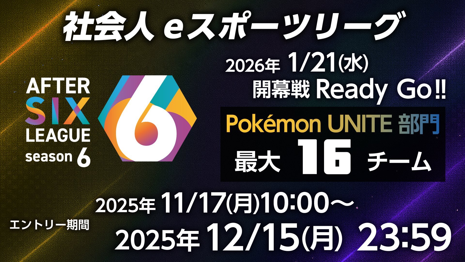 - 大会概要 【ゲームタイトル】 ポケモンユナイト【概要】 「AFTER 6 LEAGUE」は企業に勤める社会人プレーヤーを対象としたeスポーツリーグ。『ポケモンユナイト』部門は、2026年1月21日(水)、2月4日(水)、2月18日(水)の3日間オンラインで開催される。募集企業は16社で、2025年12月15日(月)23:59まで企業のエントリーを受け付けている。【フォーマット】・グループ予選→決勝トーナメント(準決勝・決勝)・BO1、決勝はBO3・各社10名まで(スターティングメンバー5名、リザーブメンバー5名)・グループ予選は4グループに分けて総当たり形式・各グループ1位の4チームが決勝トーナメント進出会場 【会場】 オンライン日程 【日程】 2026年1月21日(水)〜2月18日(水)グループ予選 DAY1:2026年1月21日(水)20:00~ グループ予選 DAY2:2026年2月4日(水)20:00~ グループ予選・決勝トーナメント DAY3:2026年2月18日(水)20:00~出場チーム・選手 募集チーム数:16社エントリー情報 【エントリー〆切】 2025年12月15日(月)23:59【エントリー料金】 無料【エントリーURL】https://a6l.jp/pokemon-unite/リンク 【配信】YouTube:https://www.youtube.com/@after6league-e-509【リンク】大会公式サイト:https://a6l.jp『ポケモンユナイト』部門ページ:https://a6l.jp/pokemon-unite/公式X:https://x.com/After6League