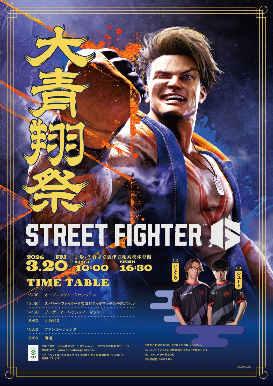 - 大会概要 【ゲームタイトル】 ストリートファイター6【概要】佐賀県立唐津青翔高校 体育館で開催される、プロゲーマーと直接交流できる特別イベント。Crazy Raccoon所属のプロゲーマー・どぐら選手、シュート選手をゲストに迎え、トークセッション、『ストリートファイター6』玄海町タッグマッチ&予想バトル、プロゲーマーバウンティーマッチ、大抽選会、ファンミーティングなどを実施する。入場は無料、事前申込も不要。試遊台は10:00から開放され、コントローラー持参も可能、座席は自由席となっている。会場 【会場】 佐賀県立唐津青翔高校 体育館【住所】 〒849-3167 佐賀県唐津市玄海町日程 【日程】 2026年3月20日(金・祝) OPEN 10:00 / START 13:00 / CLOSE 18:00出演者 どぐら(Crazy Raccoon)シュート(Crazy Raccoon)エントリー情報 【エントリー条件】 参加希望者は当日会場まで来場。事前申し込み不要。バウンティーマッチ挑戦者は当日ゲストが指名する。チケット情報 【チケット種類】 入場無料(当日受付)、事前申し込み不要リンク 【配信】当日配信は無し【リンク】イベントページ:https://event.brand-design.jp/daiseisho-fes2026/GENKAI-eSPORTS【公式】玄海町eスポーツX:https://x.com/genkai_esports