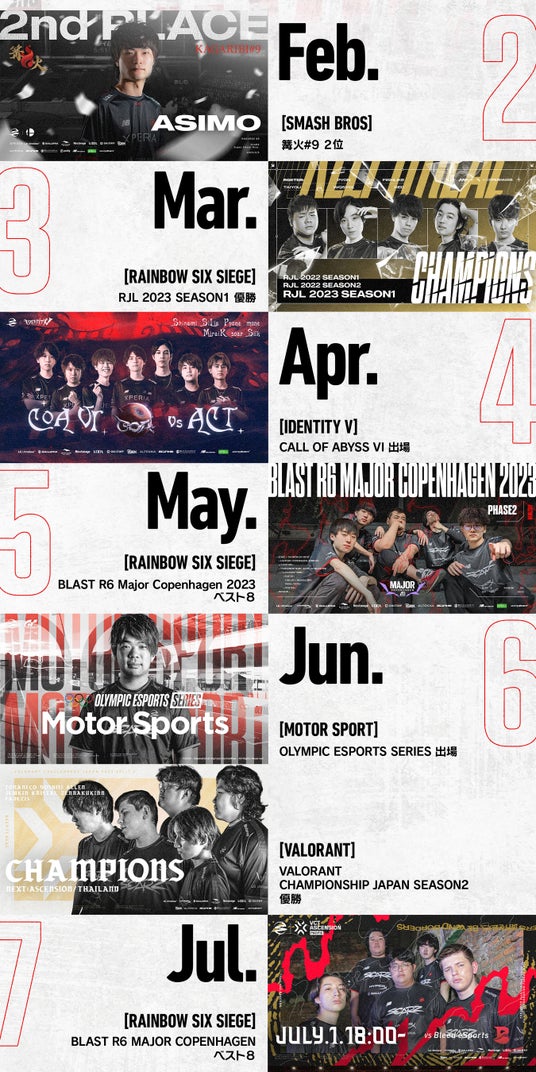 『Rainbow Six Japan League 2023 Stage 2』では国内王者として、圧巻のパフォーマンス。国内優勝を果たし、RJL年間タイトル2連覇を果たしました。また、VALORANT GC部門は『VALORANT Game Changers Japan 2023 Split 2』の予選を突破し、本戦に出場。勝者側では、優勝チームである「ZETA DIVISION」、敗者側ではアジア大会出場の「FENNEL」に敗北しました。初戦として国内のトップチームとの戦いを経て、よりいっそうパワーアップし来シーズンに挑みます。