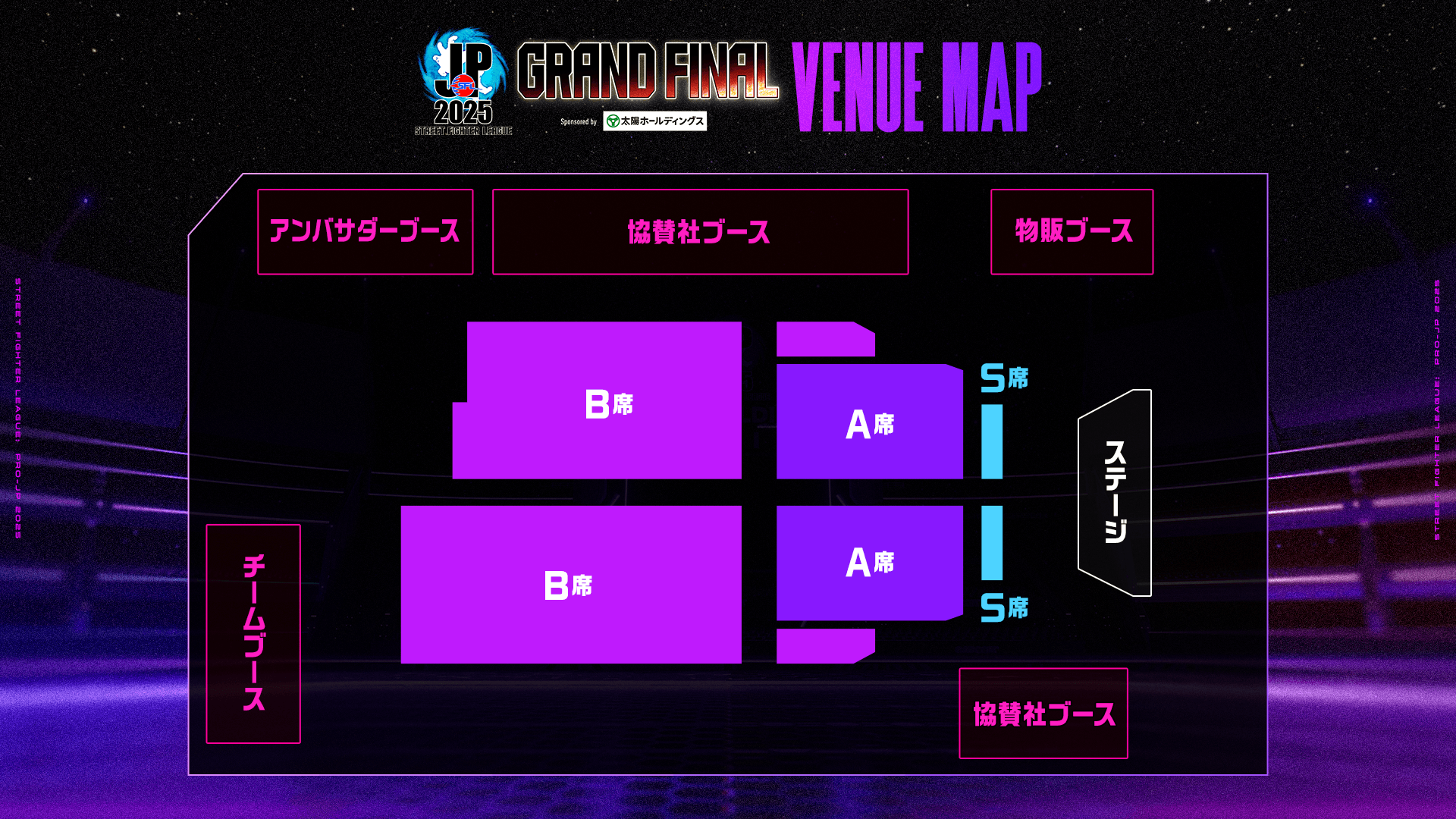 - 現在開催中の『ストリートファイター6』の国内プロリーグ「ストリートファイターリーグ: Pro-JP 2025」のグランドファイナルが2026年1月31日(土)、パシフィコ横浜にて開催。開催に伴い、会場の出展ブース情報が公開された。<以下、ニュースリリースより>「ストリートファイターリーグ: Pro-JP 2025 グランドファイナル」は1月31日(土)パシフィコ横浜で開催!会場観戦チケットは売り切れ間近! LIVE視聴チケットは「SPWN」にて販売中! 「ストリートファイターリーグ: Pro-JP 2025 プレイオフ」も開催が間近となりましたが、「プレイオフ」勝利チームが進出する決勝大会「ストリートファイターリーグ: Pro-JP 2025 グランドファイナル」の会場マップおよびブース出展企業・チームの情報を一部公開いたします。会場観戦チケットはこちら 日本最強チームの座を勝ち取り、各地域代表チームが参加する 「ストリートファイターリーグ: ワールドチャンピオンシップ 2025」に出場するのはどこのチームになるのか。いよいよ佳境に向かう「ストリートファイターリーグ: Pro-JP 2025」の結末を、ぜひ皆さんの目で見届けて下さい! また「ストリートファイターリーグ: Pro-JP 2025」年間優勝チームを決定する本イベントですが、試合だけでなく会場コンテンツも充実しておりますので、ぜひ会場観戦チケットをお買い求めいただき、足を運んでみてはいかがでしょうか。一部座席については、既に売り切れが発生しております。ぜひお早めにお買い求めください!■会場観戦チケット価格 ・S席:12,000円(税込)+手数料 ※完売 ・A席:8,000円 (税込) +手数料 ※完売 ・B席:6,000円 (税込) +手数料 ※残りわずか ※キャンセル等の理由により、完売の状況でも予告なく後日再販される場合がございます。■会場観戦チケットの購入はこちらhttps://l-tike.com/sports/mevent/?mid=766088会場マップはこちら 協賛社ブース出展一覧 太陽ホールディングス株式会社・会場限定『ストリートファイター6』キャラクターコラボグッズの配布 ・「めっちゃ緑のすごいヤツ」にちなんだブース展示 ・詳細は太陽ホールディングス公式Xアカウント(@Taiyo_hd)にて順次公開スズキ株式会社・「GSX-8R Tuned by JURI」の展示Red Bull・レッドブルドリンクの販売ふもっふのおみせ・「VARMILO KASSAI」など本大会で紹介したコントローラーの試遊コーナー ・取り扱い商品の展示・物販公式応援アンバサダーブース ©ぶいすぽぶいすぽっ!・リーグ本節の振り返り展示 ・フォトスポットの設置 ・ぶいすぽっ!仕様の応援ボード配布 ※当日はブースの出展に加え、公式応援アンバサダーメンバーによるグランドファイナルの同時視聴配信も実施いたします。ブース出展チーム一覧 ※出展内容は現状予定している内容となり、予告なく変更となる可能性がございます。【Division S】■Victrix FAV gaming ・物販 ・グリーティング ・対戦会■Good 8 Squad ・物販■Saishunkan Sol 熊本 ・物販 ・グリーティング■CAG OSAKA ・物販 ・グリーティング■名古屋NTPOJA ・物販 ・グリーティング【Division F】■VARREL ・物販 ・グリーティング ・写真撮影/サイン会■ZETA DIVISION Geekly ・物販 ・グリーティング■DetonatioN FocusMe ・物販 ・グリーティング■広島 TEAM iXA ・物販 ・対戦会■REJECT ・物販 ・グリーティング会場ではSFリーグ公式グッズの先行販売を予定! グランドファイナル会場では、SFリーグ特別イラストを使用したグッズを始め、他にもさまざまなグッズを販売予定です。特別イラストを使用したグッズは先行販売商品となりますので、ぜひ会場でお買い求めください。ガチャガチャスポット「CAPSULE LAB(カプセルラボ)」も出展! ガチャガチャスポット「CAPSULE LAB(カプセルラボ)」もグランドファイナル会場に出展いたします。 今回、会場先行商品をご用意していますので、ぜひご来店ください! 商品の詳細等の情報は後日公開いたします。「CAPSULE LAB」の公式サイトをぜひご確認ください。 ■CAPSULE LAB公式サイトhttps://www.capcom.co.jp/amusement/brands/capsule/「ストリートファイターリーグ: Pro-JP 2025 プレイオフ」は12月13日(土)~14日(日)に渡り開催! Live視聴チケット発売中! 出展情報も一部公開され、さらに期待が高まる「グランドファイナル」ですが、本大会への進出チームを決める「ストリートファイターリーグ: Pro-JP 2025 プレイオフ」は、12月13日(土)~14日(日)の2日間にわたって開催いたします。 視聴にあたっては電子チケット販売プラットフォーム「SPWN」にてLive視聴チケットをお買い求めください。■対戦カード 【DAY1】 TEAM MATCH 1:名古屋NTPOJA vs Crazy Raccoon TEAM MATCH 2:Good 8 Squad vs TEAM MATCH 1 勝利チーム 【DAY2】 TEAM MATCH 1:広島 TEAM iXA vs ZETA DIVISION Geekly TEAM MATCH 2:REJECT vs TEAM MATCH 1 勝利チーム■LIVE視聴チケット価格【セットチケット】 ・プレイオフ & グランドファイナル セットチケット(3日分):6,000円(税込) ・プレイオフ セットチケット(2日分):5,000円(税込)【単日チケット】 ・プレイオフ DAY1 単日チケット:3,000円(税込) ・プレイオフ DAY2 単日チケット:3,000円(税込) ・グラン