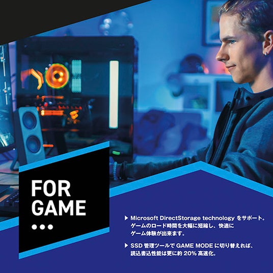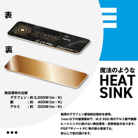 専用ツールを使ってGAME MODEにすることで、さらに約20%高速化が可能となっており、PCだけでなく、PS5のアップグレードにもオススメなSSDとなっています。銅箔とグラフェン素材を併せた極薄のヒートシンクを搭載しており、騒音を発することなく放熱性能を高めています。