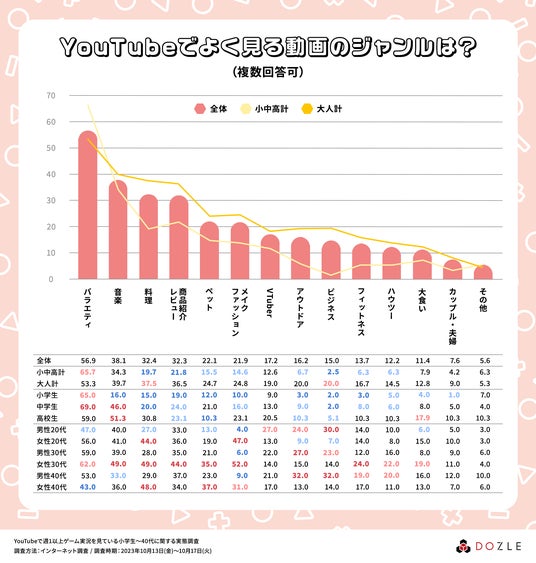 大人計では「バラエティ系」が5割強で、「音楽系」「料理系」「商品紹介・レビュー系」が4割弱と並び、幅広いジャンルを視聴する結果に。