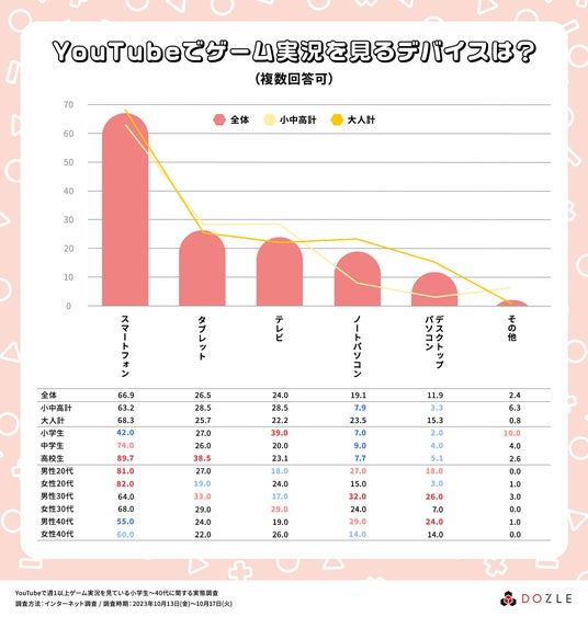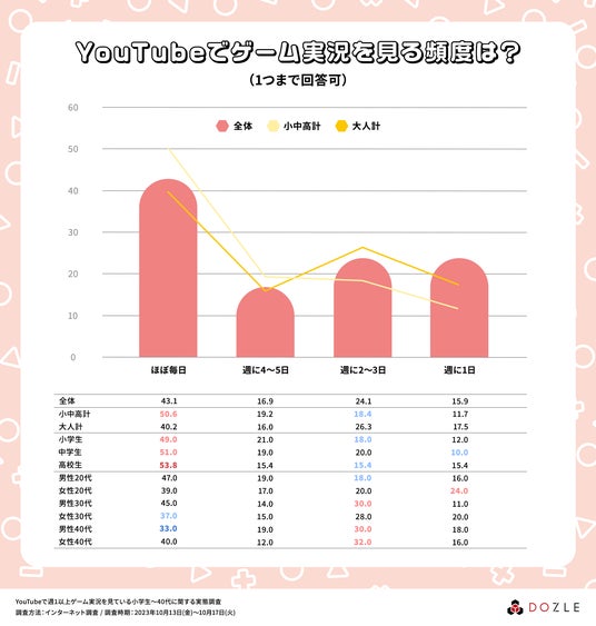 YouTubeでゲーム実況を週1以上見ている小学生・中学生・高校生、20代~40代の男女にアンケート調査をしました。