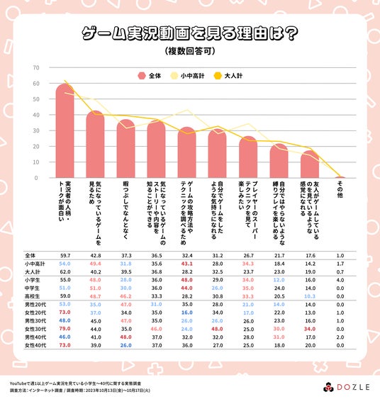 一方、小学生・中学生では「ゲームの攻略方法やテクニックを調べるため」が4割半ばと比較的高く、自身のゲームプレーに生かすために視聴しているのではないでしょうか。