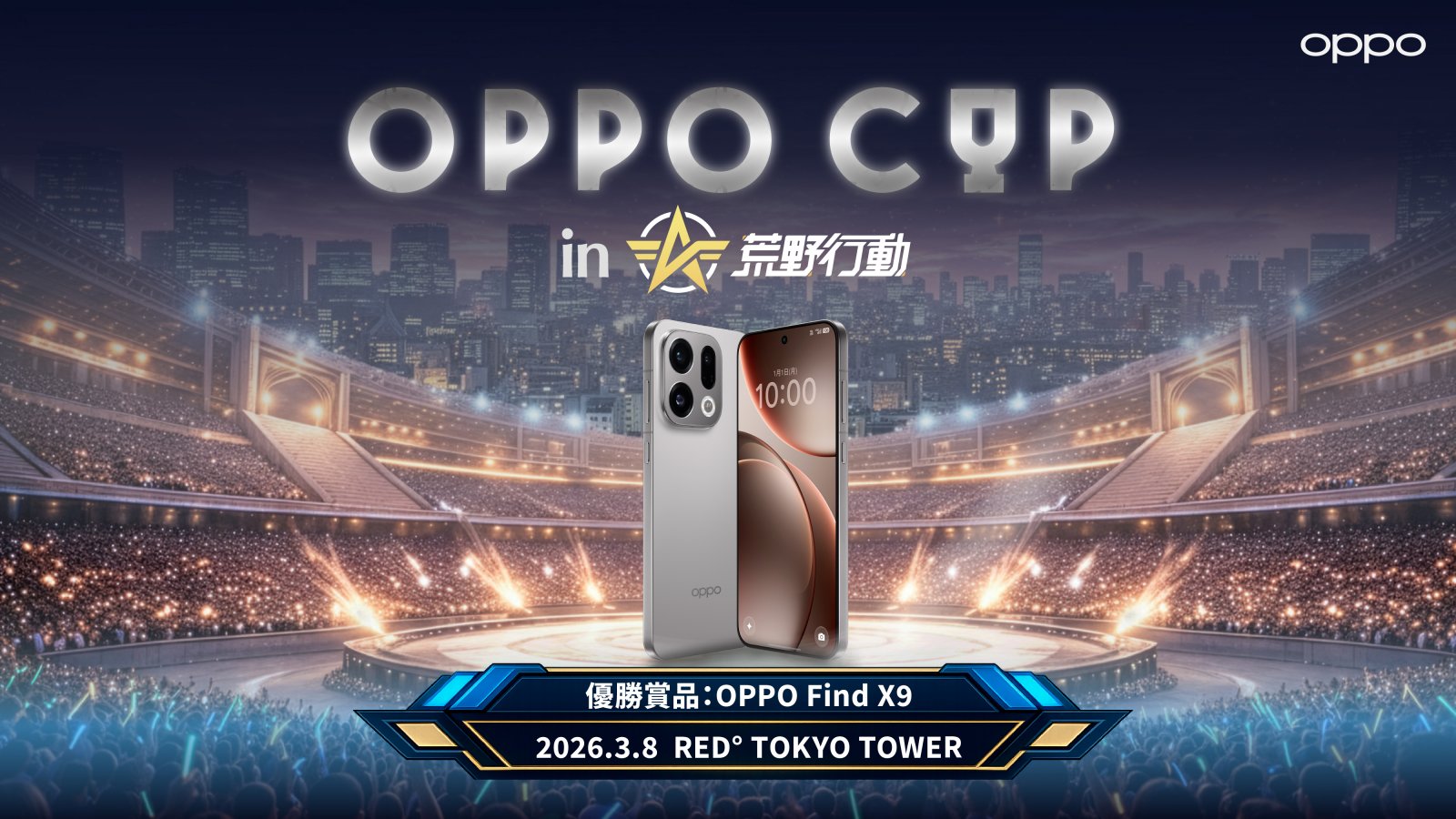 - 大会概要 【ゲームタイトル】 荒野行動【概要】 スマートデバイスブランドOPPOが開催する、日本市場参入後初となるeスポーツ大会「OPPO CUP in 荒野行動」。会場は東京・RED° TOKYO TOWER。一般参加者による予選と、上位入賞者とプロチームαDメンバーが共闘する決勝戦を実施。大会ではスマートフォン「OPPO Find X9」または「OPPO Find X8」を使用し、決勝戦での上位入賞者には、OPPO Find X9、ミドルハイクラスのスマートフォンOPPO Reno14 5Gや、ワイヤレスイヤホンのOPPO Enco Buds3 Pro、ゲストのαD関連グッズが贈られる。【フォーマット】予選:会場の30名でポイント制シングル1ゲームを3試合実施。試合ごとに参加者は交替制。決勝:各予選の上位10名とゲストプロ選手2名の合計32名で、ポイント制シングル1ゲームを1試合実施。会場 【会場】 RED° TOKYO TOWER【住所】 〒105-0011 東京都港区芝公園4丁目2-8 東京タワー3階 フットタウン日程 【日程】 2026年3月8日(日)13:00~18:00(再入場可能)出場チーム・選手 プロチーム「αD」メンバー(メンバーは後日発表)賞金 優勝:OPPO Find X9(Android スマートフォン)準優勝:OPPO Reno14 5G(Android スマートフォン)3位:OPPO Enco Buds3 Pro(ワイヤレスイヤホン)エントリー情報 【エントリー条件】16歳以上であること※18歳未満の場合は、保護者の同意を得ていることほか、申し込みフォームから詳細を確認【エントリー〆切】2026年3月1日(日)23:59【エントリー料金】 無料【エントリーURL】https://forms.gle/KuC3kRS8oQfHRA1p9リンク 【リンク】 OPPO公式サイト:https://www.oppo.com/jp/ OPPO公式X:https://x.com/OPPOJapan/