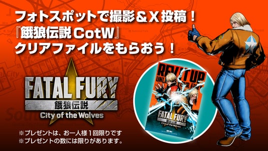 SNKブース内のフォトスポットで撮影した写真にハッシュタグ( #CotW )をつけてX(旧Twitter)に投稿すると、『餓狼伝説 CotW』クリアファイルをプレゼント。ぜひSNKブースにお越しください。