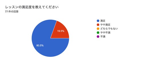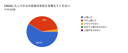 『CRGS』受講生を対象に自身のスキルアップに関するアンケートを実施したところ、97.4%の方が本サービスの受講により「成長を実感した」と回答しました。また、レッスン(マンツーマンコーチング)の満足度についての質問では、100%の方が「満足」と回答しました。