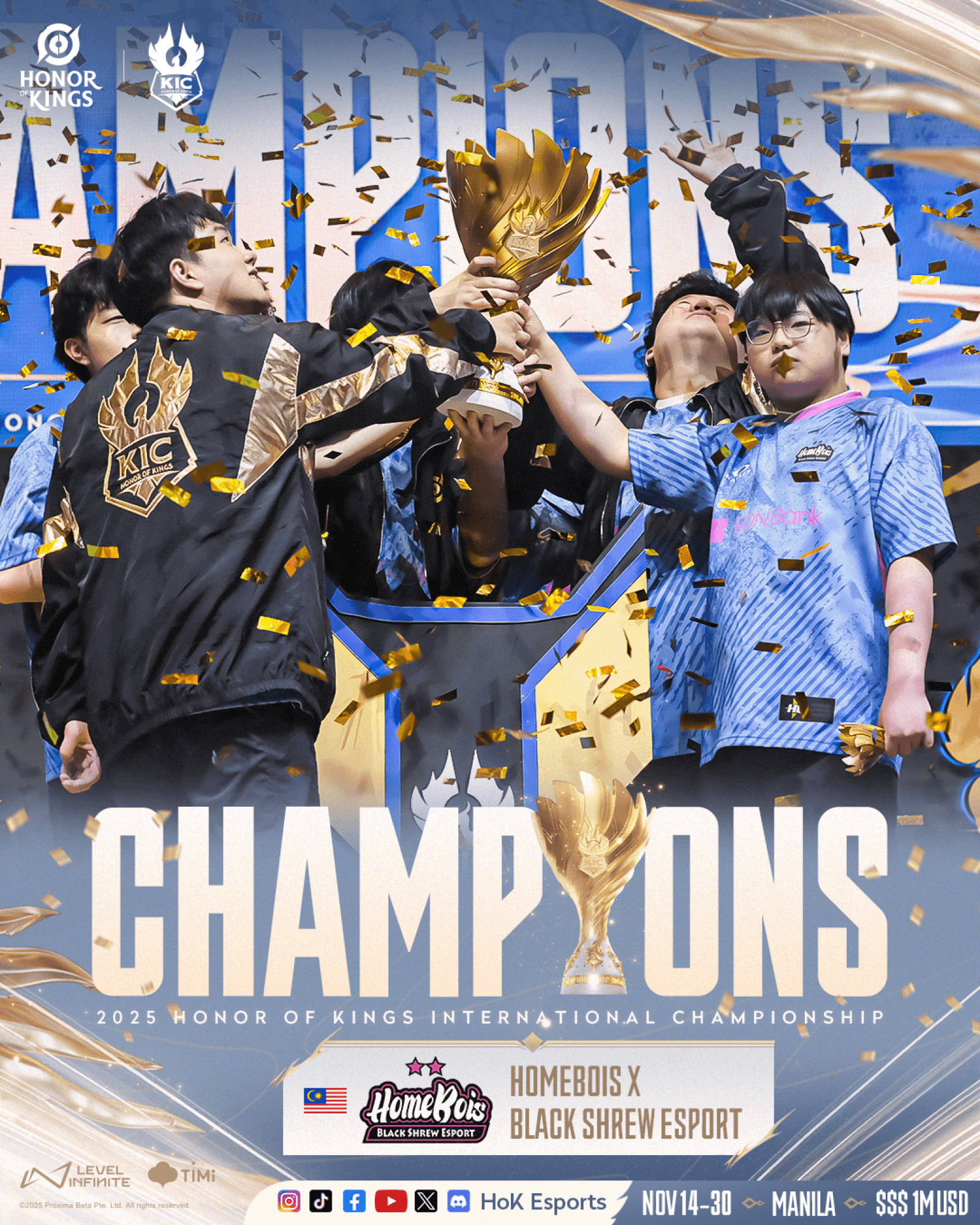 - MOBAゲーム『Honor of Kings』の世界大会「Honor of Kings International Championship」が2025年11月30日(日)にフィリピン・マニラで開催され、マレーシア代表のHomebois x Black Shrew Esportが優勝した。<以下、ニュースリリースより>KIC2025の優勝チームはHomebois x Black Shrew Esport (HBSE) 世界で最もプレイされている MOBA ゲーム*1 『Honor of Kings(オナー・オブ・キングス)』のeスポーツ大会、「2025 Honor Of Kings International Championship(KIC2025)」が11月30日(日)にフィリピンのマニラにて開催され、Homebois x Black Shrew Esport(HBSE)が優勝チームに輝き、念願のチャンピオンシップタイトルと賞金総額100万米ドルの獲得という栄誉を手にしました。今回FMVPに選ばれたのは、決勝戦での活躍が認められたGuiYu選手で、チームの勝利をゲーム内に永続的に刻み込むFMVP限定スキンも合わせて授与されました。 マニラ市内のアヤラモール マニラベイで開催された HBSE は、生配信された対決で NOVA Esports と対戦し、何千人ものファンの前で 4-0 の圧勝を収めました。 新たに追加されたミニバトルゲームモードは、草の根プレイヤーでも挑戦しやすい敷居の低い競争舞台を提供することで、これまで1,000人以上のプレイヤーが参加、累計1,500試合以上が行われています。 今回ファンは、世界的に高い評価を得ているフィリピンのポップグループSB19による特別なパフォーマンスにも魅了されました。SB19は、大会のサウンドトラック「Burn The Flame」を披露しました。この曲は、フィリピン・サウジアラビア・アラブ首長国連邦・カンボジアのiTunesトップソングチャートとトップアルバムチャートで1位を獲得しました。(英語版とタグリッシュ版)「Burn The Flame」は、eスポーツ選手を頂点へと導く情熱を鮮やかに描き出しています。会場に集まったファンは、HOKカーニバルにも参加し、『Honor of Kings』限定グッズを獲得しました。 さらに、KIC2025では総額5,400米ドルの賞金総額を誇る「Honor of Queens」が輝きを放ちました。決勝戦ではAG GlobalとCosmic Universityが対戦し、AG Globalが優勝を果たしました。2026年『Honor of Kings』グローバルeスポーツ ロードマップ 2026年の『Honor of Kings』 eスポーツプログラムは、これまで以上に大規模かつ大胆なものとなる予定です。この年は「Honor of Kings Invitationalシーズン4」からスタートし、「Honor of Kings Regional Pro League Spring」の開催、そして「Honor of Kings Nation Clash」へと続きます。 夏には、『Honor of Kings』がHonor of Kings World Cupでeスポーツワールドカップに復帰します。その後、「Honor of Kings Regional Pro League Fall」へと移行し、最終的には2026年に開催される栄誉ある「2026 Honor of Kings International Championship」に向けて準備を進めていきます。 さらに、女性に向けたHoK草の根シリーズである「Honor of Queens Tournament」が2026年、待望の復活を果たし、競技シーンをさらに拡大します。ゲーム内名誉の授与 『Honor of Kings』のゲーム内で優勝チームを称えるというコミットメントに基づき、2026 年には大会優勝者向け限定報酬の選択肢を拡大します。主要イベントの優勝者には、次のようなゲーム内での特別な栄誉が贈られます。インドネシア文化をモチーフにした特別なスキンが、「Honor of Kings Invitational シーズン4 (KIS4)」で登場します。 「Honor of Kings Regional Leagues」 - 春:IKL/MKL/PKL 優勝チームをテーマにした元流の子スキン 「Honor of Kings Nation Clash」:優勝地域をテーマにカスタマイズした元流の子スキン 「KWC at EWC 2026」:KWC 限定スキン 「Honor of Kings Regional Leagues」 - 秋:IKL/MKL/PKL 優勝チームをテーマにした 元流の子スキン 「Honor of Kings International Championship (KIC2026)」:KIC eスポーツスキンとFMVP限定スキン ゲームバージョンアップデートのお知らせ 12月16日(火)には、新ヒーロー「チーシャ」の登場に加え、新システム、新ゲームプレイ、そしてより充実した体験を提供する「BONDS」バージョンへのアップデートが実装されます。12月20日(土)の年末サプライズデーには、HoKが今年一番のボーナスと特別な特典を含む、素晴らしい報酬をお届けします。どうぞお楽しみに! 『Honor of Kings(オナー・オブ・キングス)』は現在iOSとAndroidでプレイ可能です。 以下URLより無料でダウンロードいただけます。 App Store:https://apps.apple.com/jp/app/honor-of-kings/id1619254071 Google Play:https://play.google.com/store/apps/details?id=com.levelinfinite.sgameGlobal&hl=ja日本語版公式サイトおよびSNS Honor of Kings (オナー・オブ・キングス)公式サイト:https://www.honorofkings.com/jp/ Honor of Kings(オナー・オブ・キングス)X: https://x.com/hok_jp Honor of Kings Japan Esports情報局 X: https://x.com/hokjp_esports Honor of Kings Japan Discord: discord.gg/ExBmZdRjCR