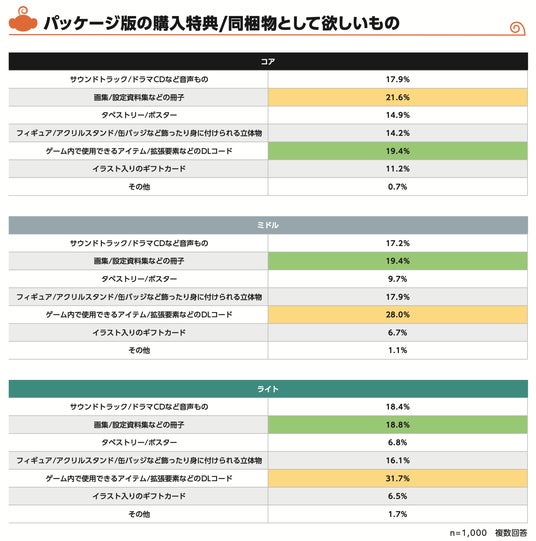 ・購入特典/同梱物として欲しいものはライト層/ミドル層が「ゲーム内で使用できるアイテム/拡張要素などのDLコード」、コア層は「画集/設定資料などの冊子」が最多
