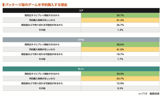 調査では、家庭用ゲーム機ユーザーの多くが物理的にゲームを所有したいと考え、予約購入する理由としては購入特典が最多であった。また、コア層では大きめの立体物特典が好まれる傾向が見られた。