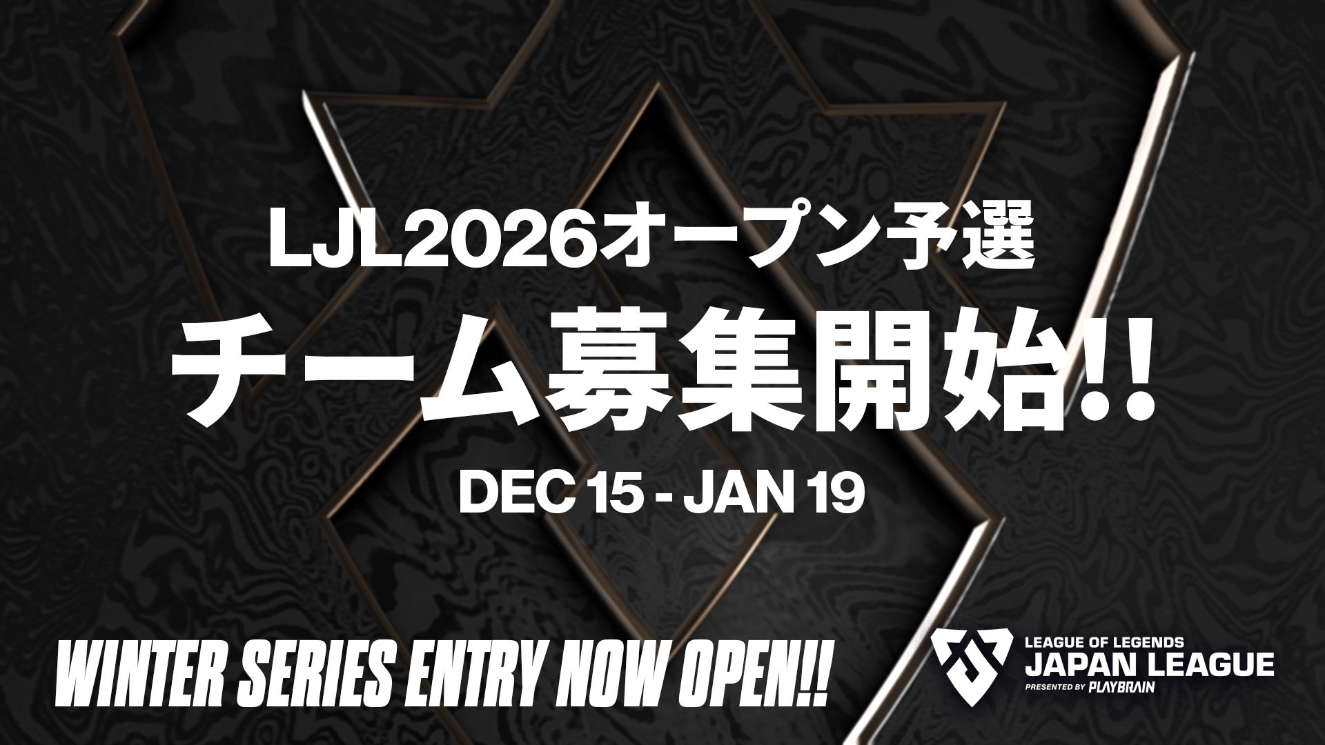 - 大会概要 【ゲームタイトル】リーグ・オブ・レジェンド【概要】 『リーグ・オブ・レジェンド』の日本国内競技シーン「LJL(League of Legends Japan League)」。2026年は、新たにWINTER SERIES、SPRING SERIES、SUMMER CHAMPIONSHIP(年間決勝)の年間3大会構成となる。チャンピオンシップポイント制度は継続され、WINTERとSPRINGの成績でSUMMER CHAMPIONSHIP出場チームを決定する。WINTER SERIESは、1月末にオープン予選、MAIN STAGEは2月中旬〜3月末に開催。オープン予選からMAIN STAGEへの参入枠は6枠(アカデミーチーム数等によって変動)。【フォーマット】 オープン予選出場チーム数:最大64チーム、1グループ最大16チーム※グループ数は応募チーム数に応じて調整形式:BO1、シングルラウンドロビン日程 【日程】オープン予選:1月31日(土)、2月1日(日)、2月7日(土)、2月8日(日)MAIN STAGE 1:2月21日(土)〜3月3日(火)MAIN STAGE 2:3月6日(金)〜3月15日(日)PLAY OFFS:3月28日(土)・29日(日)エントリー情報 【エントリー条件】 ・3名以上が日本国籍または「居住者」 ・代表者は日本語で円滑なコミュニケーションが可能であること ・満17歳以上である者。または、2026年9月1日時点で満17歳以上である者 ・ランクが過去のスプリット終了時にダイヤモンド3以上、または「LJL」や公式大会の実績があること【エントリー〆切】 2025年12月15日(月)〜2026年1月19日(月)23:59【エントリーURL】https://forms.gle/aKpWSQ8iQvoJQfPc8リンク 【リンク】 LJL公式サイト:https://taiyoro.gg/ja/ljl2026 LJL公式X:https://x.com/Official_LJL LoL Esports Japan 公式X:https://x.com/lolesports_jp