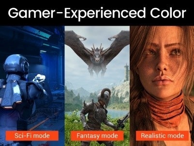 数百におよぶゲームタイトルのアートスタイルに関するデータベースを構築および分析した、新たな3種類(ファンタジー/Sci-Fi/リアリスティック)のカラーモードを搭載しています。これにより、FPSやRPGなどのゲームジャンルに基づき調整された従来のカラーモード以上に、さまざまなゲームの世界観に適した映像表示ができるようになります。