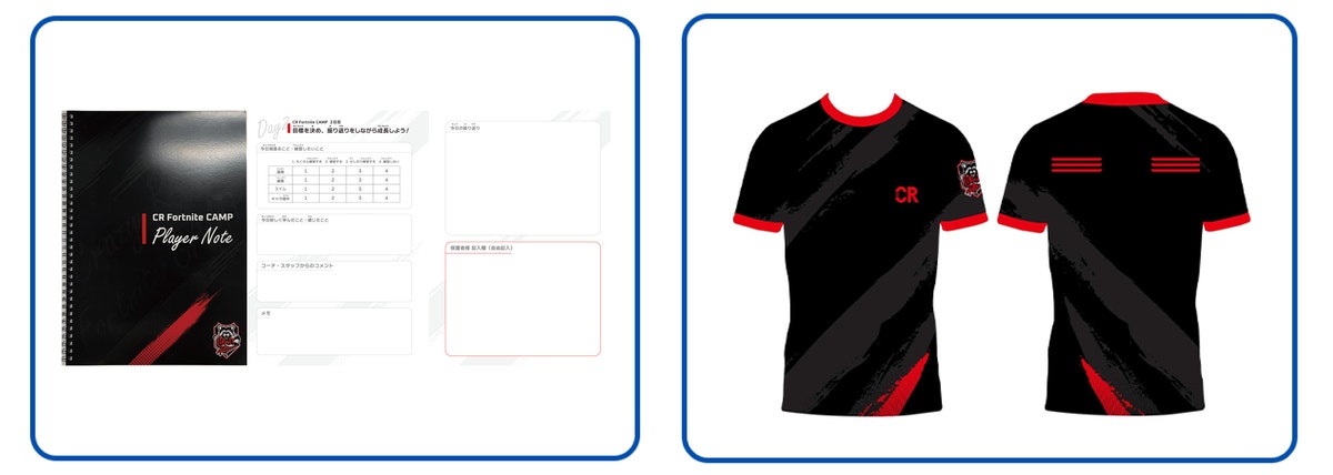 参加者全員に2日間の体験を冊子として“カタチ”に残せるオリジナル冊子「プレーヤーノート」と「イベント限定ユニフォーム」をプレゼント。イベント最終日に開催される大会でユニフォームを着用し、Fortnite公式キャスターによる実況やインタビューを受けながら、プロゲーマーの臨場感を体感することができます。また、ユニフォームを着用してのプロカメラマンによる宣材写真撮影も行われ、後日撮影データをプレゼントいたします。