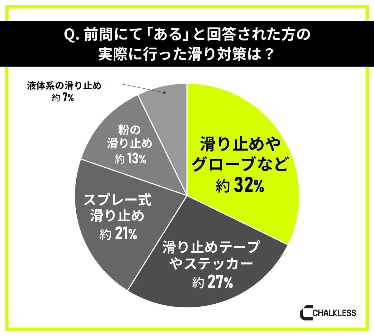 結果は下記のとおりでした。グローブなどの滑り止めを使用している方が多く、次いで滑り止めテープやステッカー、スプレー式、粉、液体系など、さまざまな対策を講じていることが分かりました。