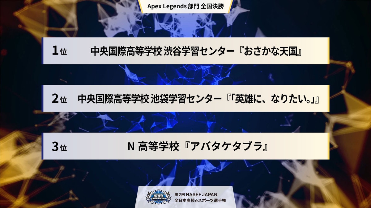 中央国際高等学校渋谷学習センター「おさかな天国」が全142チームの頂点に輝きました。優勝後にkou選手は「うれしい気持ちが第一としてあるが、同じくらい安心した。チームメイトが強いので、絶対に優勝できるという気持ちをもって大会に挑むことができた」と喜びを語りました。
