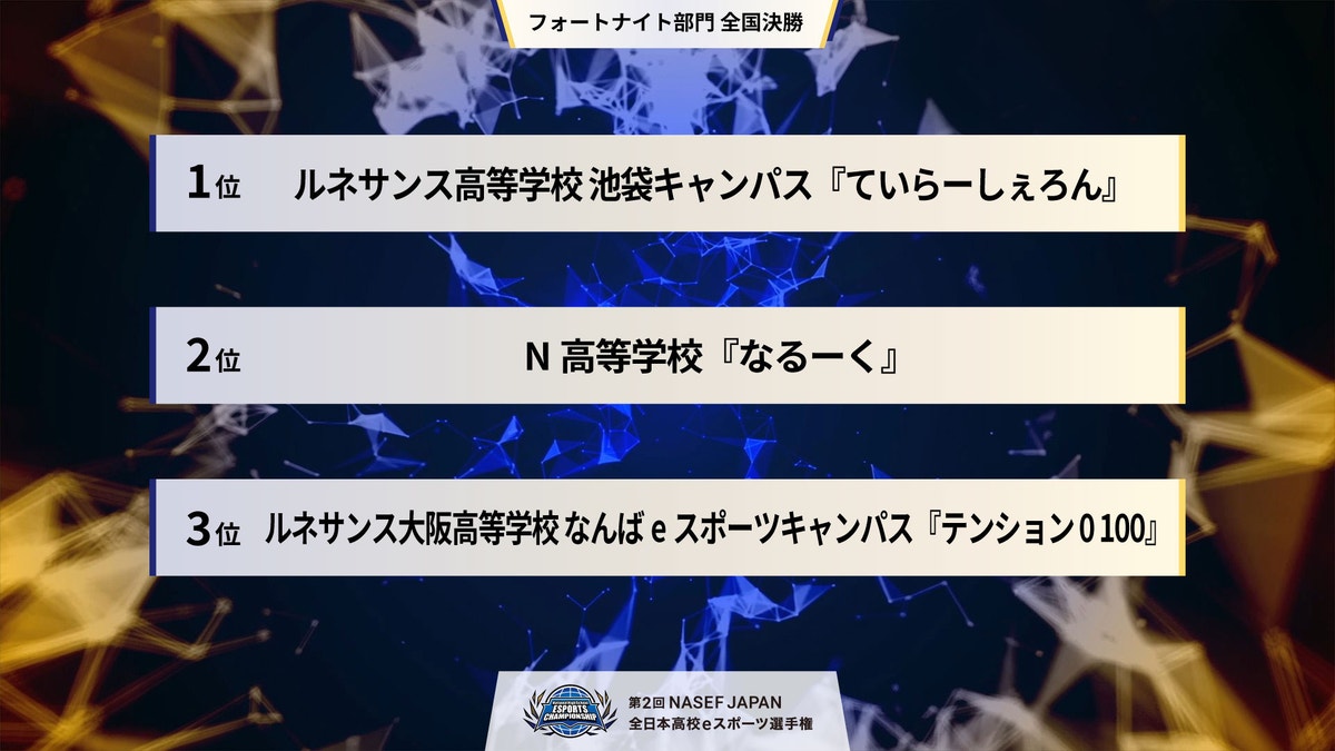 ルネサンス大阪高等学校なんばeスポーツキャンパス「テンション 0 100」が3位という結果を残しました。