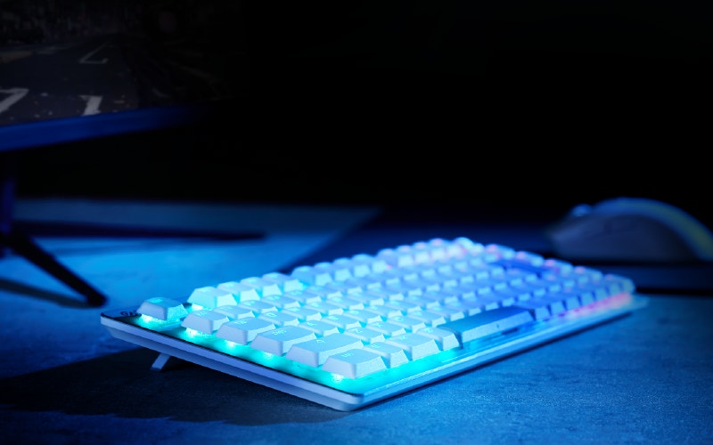 すべてのキーに、ゲーム環境を彩る 1,677万色RGBライティングを搭載しています。光り方のパターン、速度、色などは好みに合わせてカスタマイズも可能です。キーボード本体に、LEDの設定を保存できるメモリを搭載しています。