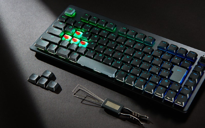 ガンシューティング系ゲーム(FPS)の高速な指の動きにハマるキー形状・配列を実現。スペースバーユニットの選択、ワンアクションでのプロファイル切り替えなど、勝つために最適な設定をアレンジできる、75%サイズの無線メカニカルゲーミングキーボード ロープロファイルスイッチ搭載モデルです。