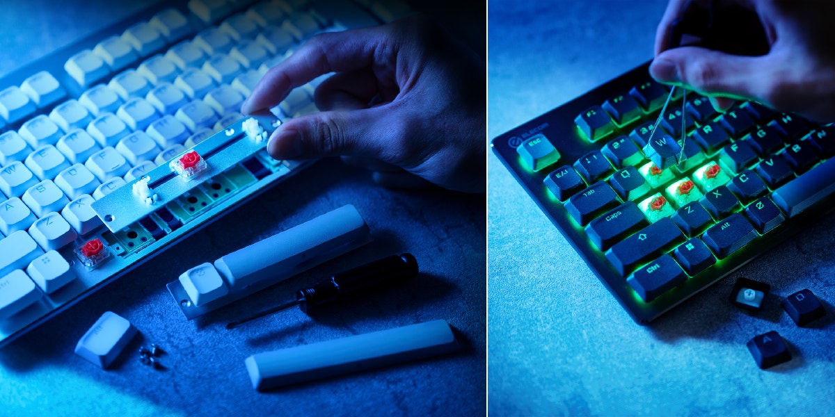 はんだ付けなしでキースイッチの着脱交換が可能なホットスワップ方式に対応しています。付属のスペースバーユニットを付け替えることで、ロングスペースバー/無変換キー + ショートスペースバーの2パターンを選択可能。好みのスペースバーの長さでプレーできます。加えて、エレコムゲーミングの純正キーキャップを同梱しています。
