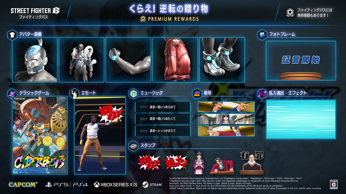 今回の「ファイティングパス」プレミアム報酬では「トノサマンプライムボディ」や「トノサマンプライムブーツ」などのトノサマンプライムになりきれるアバター装備が登場! また、逆転裁判といえば「異議あり!」のエモートや「待った!」といった代表的なセリフのスタンプが手に入るぞ!