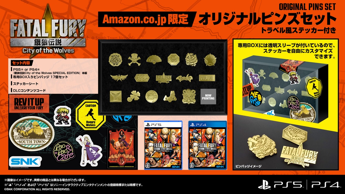 SNKが2025年4月24日(木)発売予定の『餓狼伝説 City of the Wolves』パッケージ版(PS5®/PS4®)の店舗別購入特典を公開。Amazonはピンズセット付き19,800円、ebtenはDXパック14,520円、楽天ブックスやゲーマーズなど各店舗でアクリルグッズやタペストリーを提供。