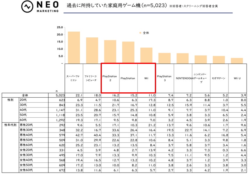 一方で、「PlayStation」や「Wii」などは現在の所持率が1桁台にとどまりつつも、過去の所持率は高く、Nintendo Switch以前の主流機として活躍していたことが読み取れます 。