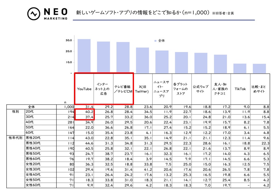 新しいゲームソフトやアプリの情報源として最も多かったのは 「YouTube」(31.4%) でした。特に20代・30代では40%前後がYouTubeを挙げています。