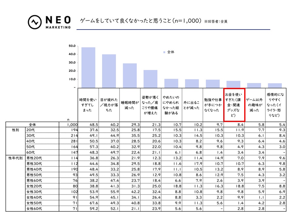 一方で、ゲーム業界でも度々問題視される「お金を使いすぎた(課金・関連グッズなど)」は8.4%と10%未満にとどまり、課金による後悔は比較的限定的であることがうかがえます。いわゆる“課金沼”に陥る人は、ユーザー全体で見ると一部にとどまっている可能性が高そうです。