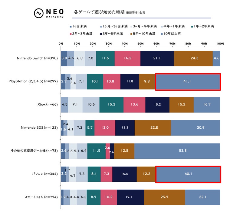 PCゲームとPlayStation系ゲームのユーザーは、他のプラットフォームと比べ“長年ゲームを楽しんでいる年季の入ったユーザー”の存在が目立ちました。