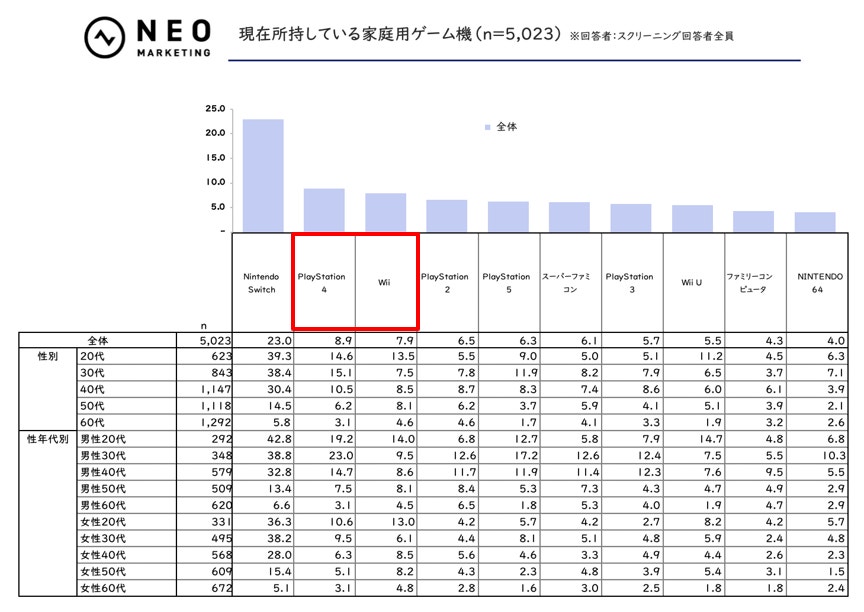 この差は、PlayStation 5やゲーミングPCが“性能重視・深く遊び込むタイプのゲーム環境”としてとらえられており、比較的ゲームへの関与度が高い男性層に強く支持されていることを示しているのかもしれません。