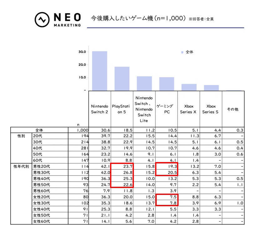 逆に言えば、「Switch 2」が年代・性別問わず幅広い層に期待されているのに対し、PS5やゲーミングPCは“尖った購買意欲”を持つ層に支持されている構図が鮮明になったと言えるでしょう。