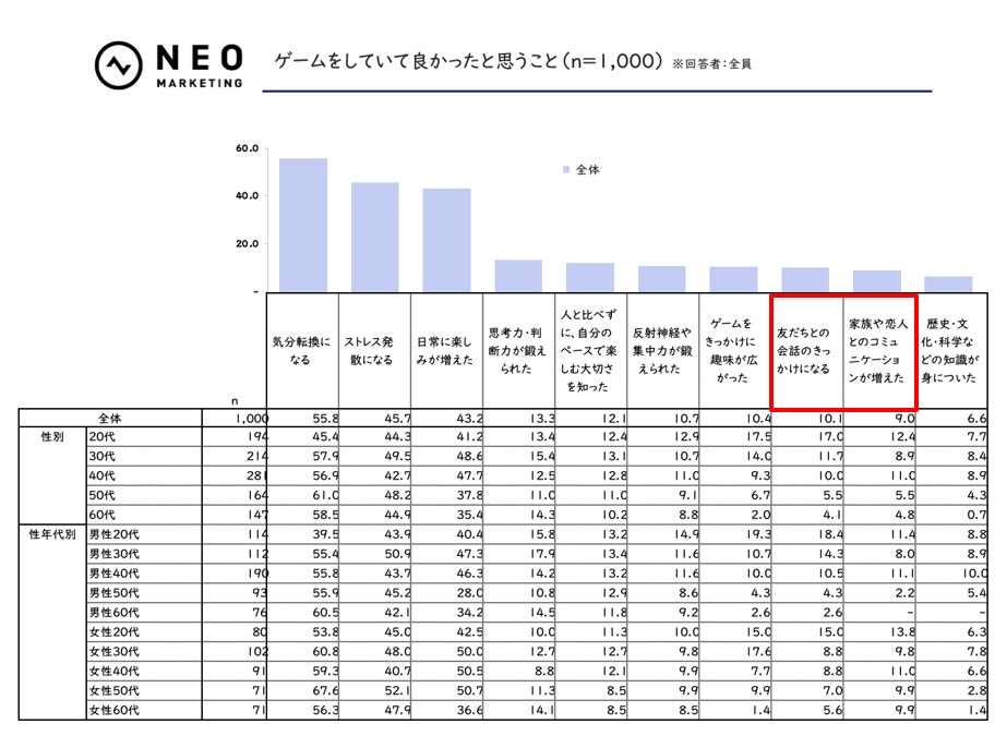 ゲームをしていて良かったと思うこと(n= 1,000)