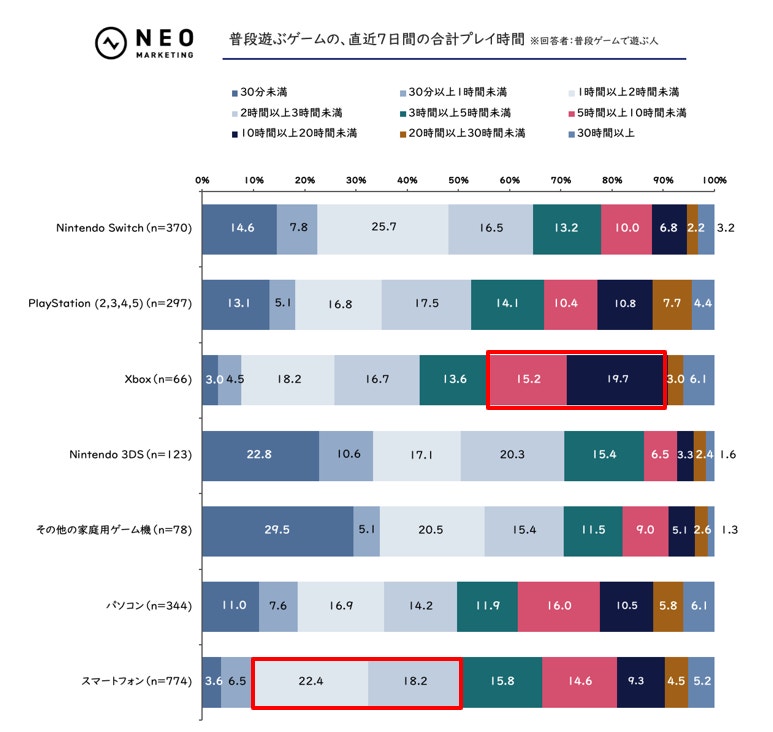 一方で異彩を放っていたのが「Xbox」です。「10時間以上20時間未満」が最多の19.7%を占め、さらに「5時間以上10時間未満」も15.2%と高水準。ユーザー数は他ハードに比べて少ないものの、一人あたりのプレー時間が長い“コア層”が多い傾向が読み取れます。