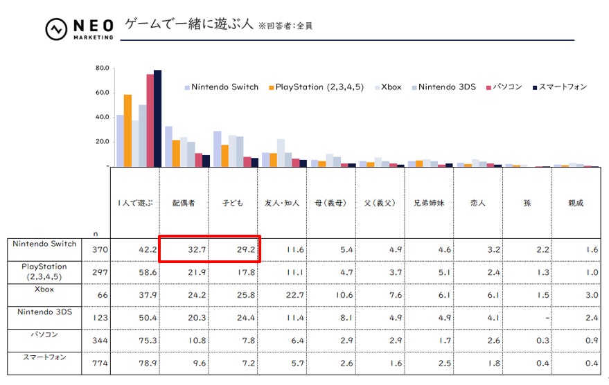 一方で「Nintendo Switch」は、配偶者(32.7%)・子ども(29.2%)と一緒に遊ぶ割合が高く、家庭内での“共遊ハード”としての存在感が際立っているのが特徴です。