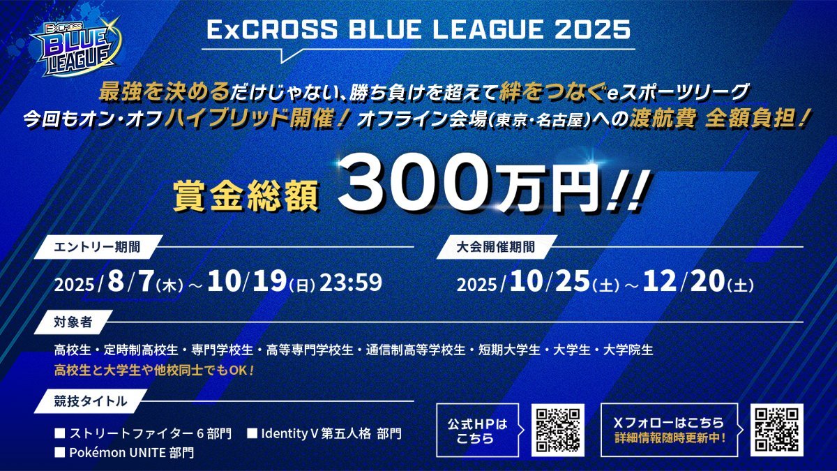 - 大会概要 【ゲームタイトル】ポケモンユナイト【概要】 中部テレコミュニケーション株式会社が開催する「ExCROSS BLUE LEAGUE 2025」は、学生を対象としたeスポーツリーグ。2回目となる今回は『Identity V 第五人格』を追加し、『ポケモンユナイト』『ストリートファイター6』と3タイトルで実施する。賞金総額は300万円。【フォーマット】ポケモンユナイト部門1stステージ:リーグ戦 BO12ndステージ:リーグ戦 BO33rdステージ:ダブルエリミネーション BO3ファイナルステージ:ダブルエリミネーション BO3会場 【会場】オンラインとオフラインのハイブリッド開催1stステージ:オンライン2ndステージ:esports Style UENO / オンライン3rdステージ:オンラインファイナルステージ:コミュファ eSports Stadium NAGOYA日程 【日程】ポケモンユナイト部門1stステージ:2025年10月25日~31日 ※予備日:11月1日2ndステージ:2025年11月8日(Day1)、11月23日(Day2)3rdステージ:2025年12月7日ファイナルステージ:2025年12月20日1stステージについて:チームリーダー同士が相談し、対戦期間内(10月25日~10月31日)に試合を行う。期間内での調整が難しい場合は予備日に対戦。賞金 総額300万円優勝:60万円準優勝:30万円3位:10万円出演者 実況・解説ポケモンユナイト部門:水上侑、たきしまチケット情報 【チケット種類】現地観戦チケット【チケット申し込みURL】応募フォーム:https://business.esports-stadium758.jp/EBL2025/news/4531300リンク 【配信】YouTube:https://www.youtube.com/@excross_ebl【リンク】大会公式サイト:https://business.esports-stadium758.jp/EBL2025ExCROSS BLUE LEAGUE公式X:https://x.com/excross_ebl