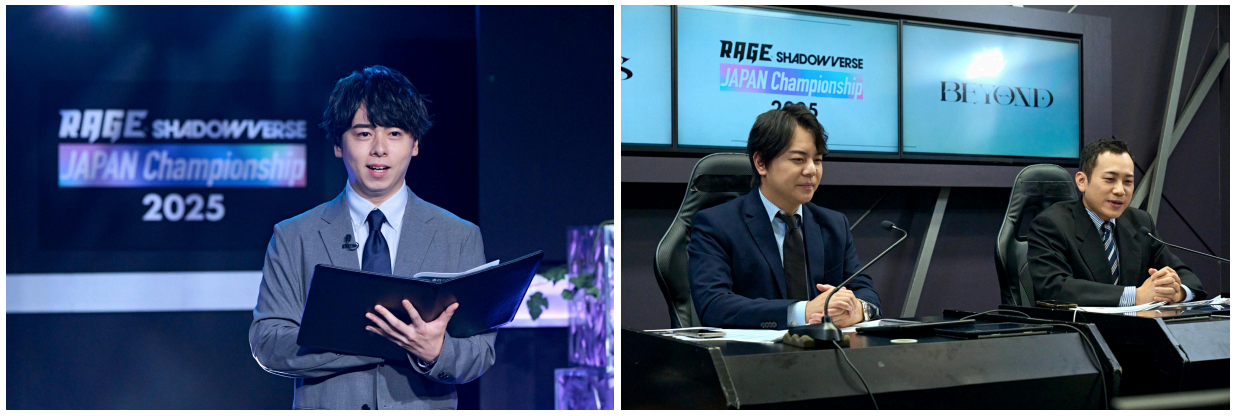 『Shadowverse: Worlds Beyond』におけるRAGE初の王者を決める今大会のGrand Finalsには、MAO選手、カシオ選手、ふぇにー選手、ミストラル選手、EvK|りょうねす選手、Junan選手、Utatomo選手、ロマネコ選手が出場しました。MCは須田泰生さんが務め、実況は友田一貴さん、平岩康佑さん、解説は海老原悠さん、ソーさんが担当し、対戦の緊張感や駆け引きを臨場感たっぷりに伝えました。