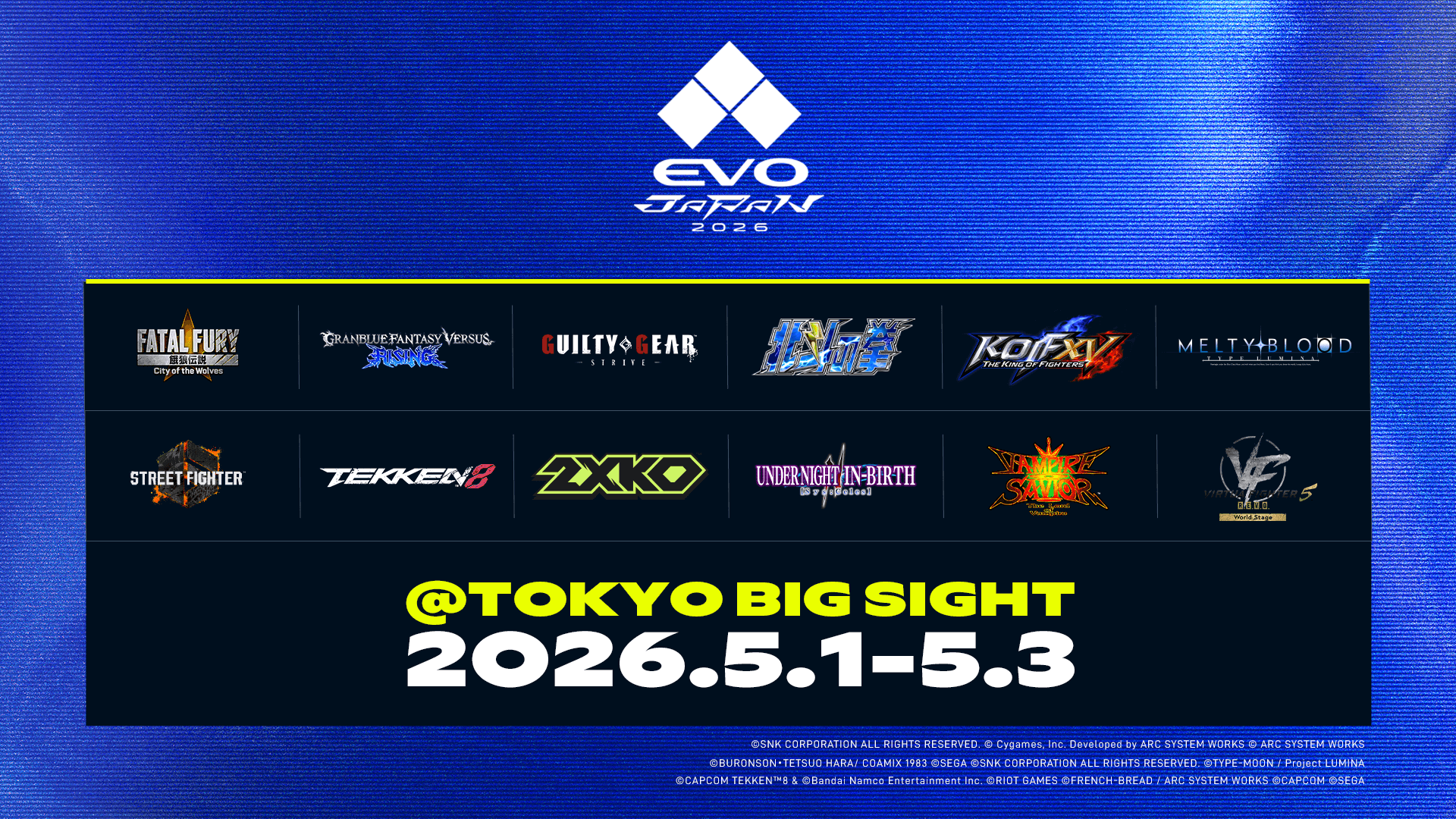 - 大会概要 【ゲームタイトル】餓狼伝説 City of the Wolves(新)グランブルーファンタジーヴァーサス ライジングギルティギア ストライヴ北斗の拳(新)THE KING OF FIGHTERS XVMELTY BLOOD: TYPE LUMINAストリートファイター6鉄拳82XKO(新)UNDER NIGHT IN-BIRTH II Sys:Celesヴァンパイアセイヴァー(新)Virtua Fighter 5 R.E.V.O.【概要】世界最大の格闘ゲームの祭典「EVO」の日本版。2026年は東京ビッグサイトにて3日間にわたって開催される。2026年大会では、前回を上回る12タイトルを実施。賞金総額は前回の2倍の3000万円に拡大した。エントリーは、「チケットぴあ」の3日感通し券入場チケット(8000円〜1万円)を購入の上、「start.gg」でエントリーフィー(タイトルごとに1000円)を支払いトーナメントに登録することで完了となる。各タイトルに人数制限があり、先着順で上限に達すると受付終了。【ルール】・トーナメントはダブルエリミネーション方式・Grand Finalではウィナーズブラケットで勝ち上がった選手とルーザーズブラケットで勝ち上がった選手が試合を実施。ウィナーズブラケット側の選手は1回勝利すれば優勝だが、ルーザーズブラケット側の選手が優勝するためには2回勝利する必要がある。・トーナメントの初期配置については、同じ地域の選手同士が当たりにくいように調整が行われるEVO Japan ルール:https://www.evojapan.gg/rules開催地 【会場】東京ビッグサイト 国際展示場 東1・2・3ホール【住所】東京都江東区有明3丁目11−1日程 【日程】2026年5月1日(金)〜3日(日)賞金 賞金総額 3000万円エントリー数に応じて賞金額が変動するエントリー情報 【エントリーの流れ】「チケットぴあ」で入場チケット(3日間通し券)を購入する 「start.gg」でエントリーフィーを支払う ※メイントーナメント参加には「入場チケット(3日間通し券)」の提示が必須。※参加タイトルごとにエントリーフィーが必要。【エントリー〆切】・チケットぴあ 入場チケット(3日間通し券)の購入~ 2026年3月16日(月)23:59・「Start.gg」でのエントリーフィー支払い~ 2026年3月16日(月)23:59【エントリー料金】入場チケット(3日間通し券)・アーリーバード 8000円(2025年12月10日〜2026年1月19日)・ノーマル 1万円(2026年1月19日〜3月2日)・レイト 1万2000円(2026年3月2日〜4月30日)※参戦にあたっては3日間通し券が必須(1日券での参加は不可)エントリーフィー1タイトル 1000円(2025年12月10日〜2026年3月16日)【エントリーURL】チケットぴあ:https://t.pia.jp/pia/event/event.do?eventBundleCd=b2564180start.gg:https://www.start.gg/tournament/evo-japan-2026/details観戦チケット情報 【チケット種類・料金】入場チケット(3日間通し券)・アーリーバード 8000円(2025年12月10日〜2026年1月19日)・ノーマル 1万円(2026年1月19日〜3月2日)・レイト 1万2000円(2026年3月2日〜4月30日)入場チケット(1日券)・金 4000円(2026年3月17日〜4月30日)・土 4000円(2026年3月17日〜5月1日)・日 4000円(2026年3月17日〜5月2日)プレミアムエリアパス・後日発表【チケット申し込みURL】チケットぴあ(観戦者向け):https://t.pia.jp/pia/event/event.do?eventBundleCd=b2564180リンク 【リンク】EVO Japan 2026:https://www.evojapan.gg/©EVO Japan 2026©SNK CORPORATION ALL RIGHTS RESERVED. © Cygames, Inc. Developed by ARC SYSTEM WORKS © ARC SYSTEM WORKS©BURONSON・TETSUO HARA/ COAMIX 1983 ©SEGA ©SNK CORPORATION ALL RIGHTS RESERVED. ©TYPE-MOON / Project LUMINA ©CAPCOMTEKKEN™8 & ©Bandai Namco Entertainment Inc. ©RIOT GAMES©FRENCH-BREAD / ARC SYSTEM WORKS ©CAPCOM ©SEGA"PlayStation"は株式会社ソニー・インタラクティブエンタテインメントの 登録商標または商標です。