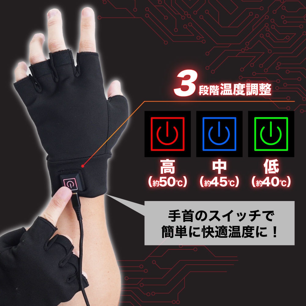 電源ボタンを押して電源を入れれば手の甲全体に搭載されたヒーター部分が発熱して手を温めます。温度が3段階切り替え可能(高約50度、中約45度、低約40度)。ストレッチ素材を採用し指先部分を出せるので、スマホ操作もそのまま可能です。ゲームやPC作業などの細かい操作も邪魔しません。