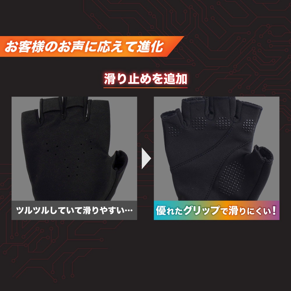 手の自然な形にフィットする縫製に。また、滑り止めがつき、操作性がさらにアップしました。
