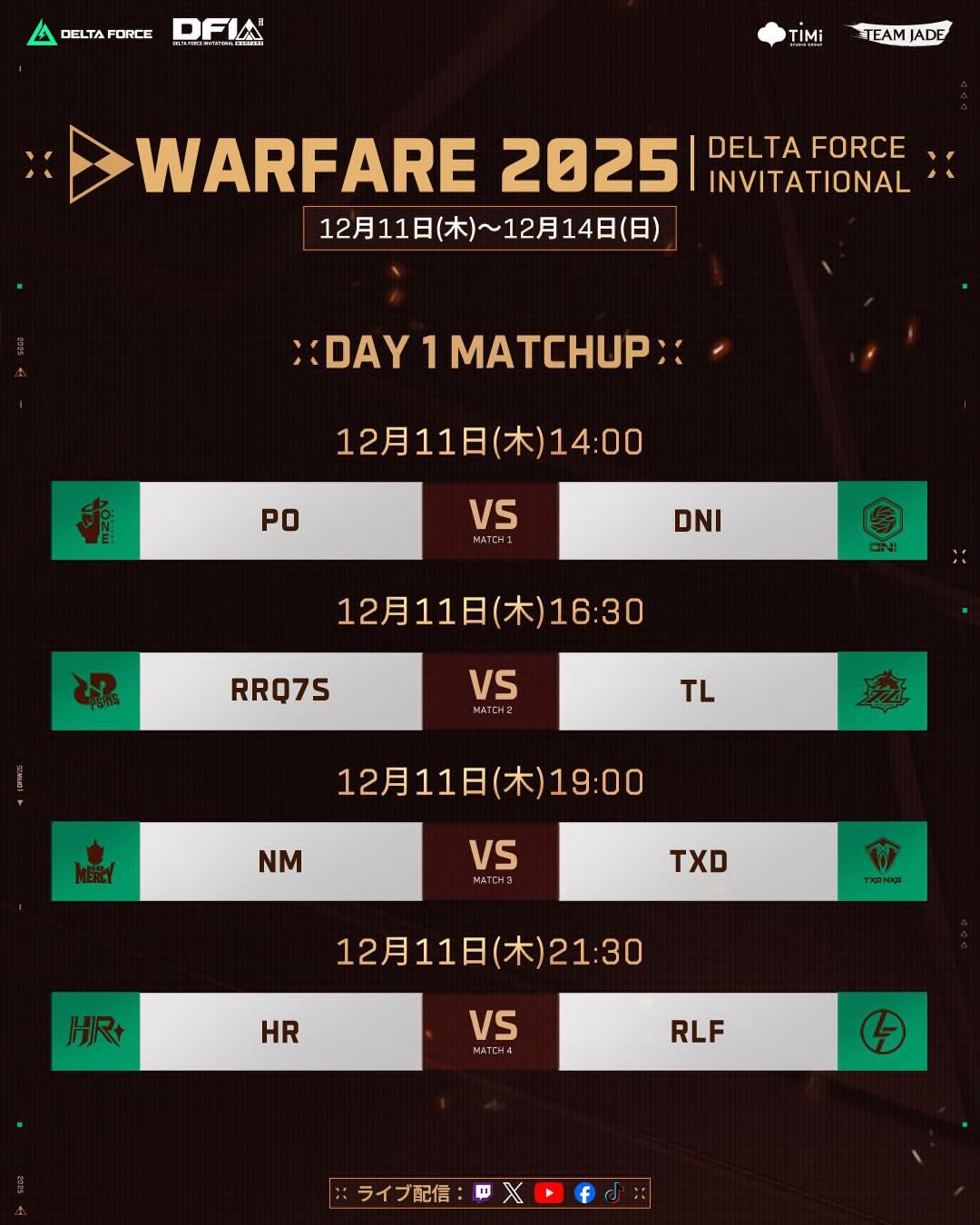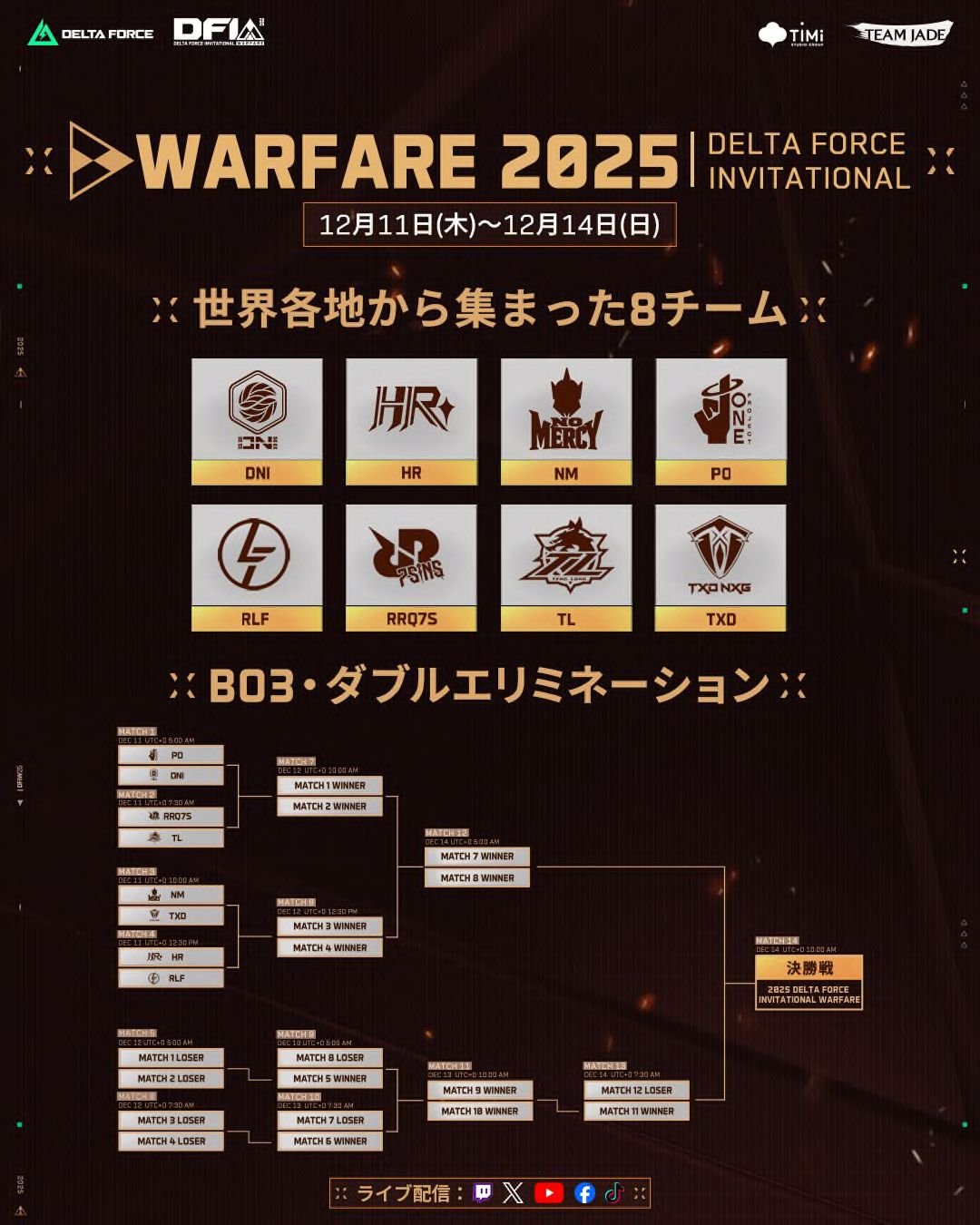 TiMi Studio Group(Team Jade)が手掛ける新作『Delta Force』の世界初公式トーナメント。世界各地から8チームが招待され、優勝賞金6万ドル(900万円)をかけて戦う。日本語でのライブ配信も実施予定。