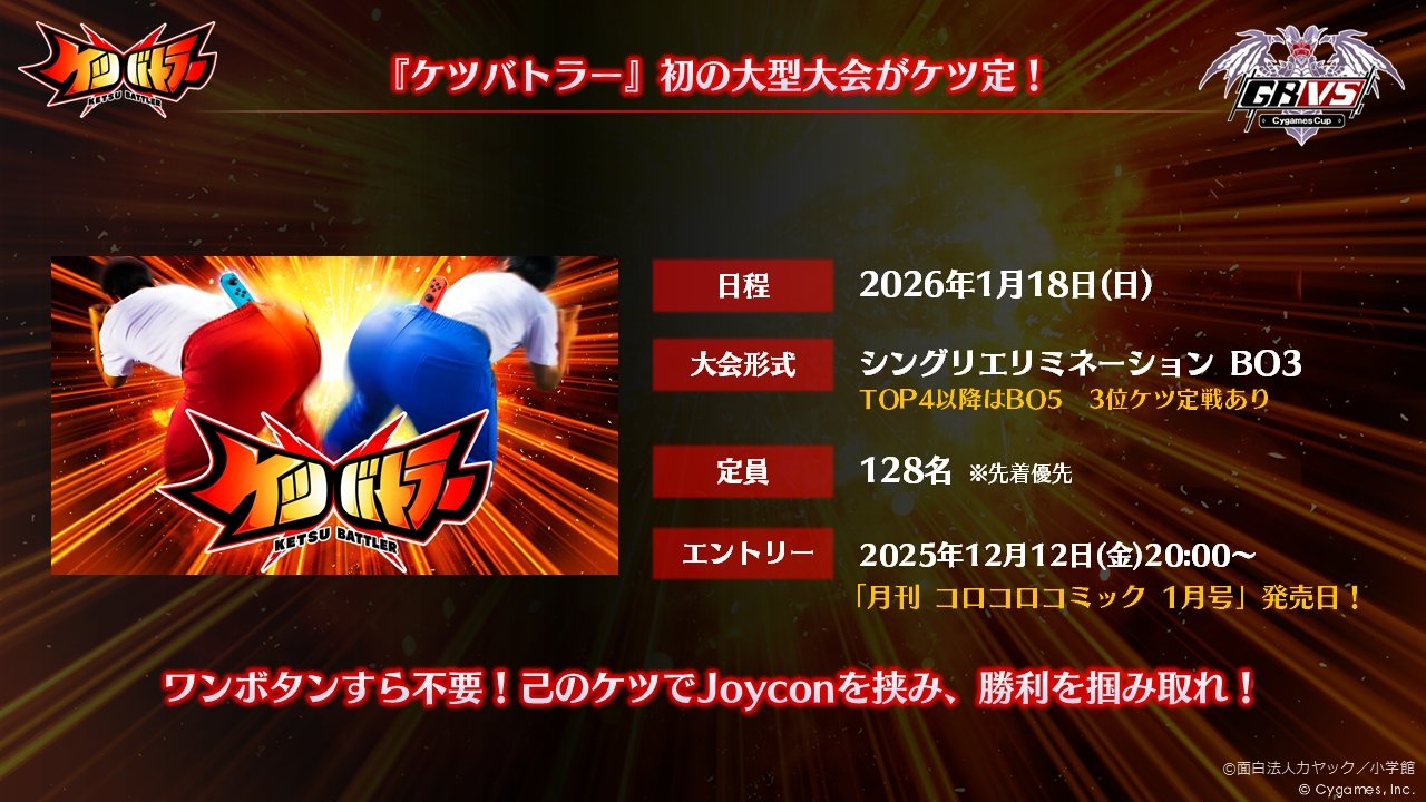 Nintendo Switch™用ゲーム『ケツバトラー』初の公式大会。『ケツバトラー』は、Joy-Conをお尻(ケツ)にセットして戦う2人対戦ゲーム。最大128名様が参加可能なオープン大会として実施され、1位〜3位にはマンガ『ケツバトラー』の作者・高出なおたか先生直筆サイン色紙が贈られる。