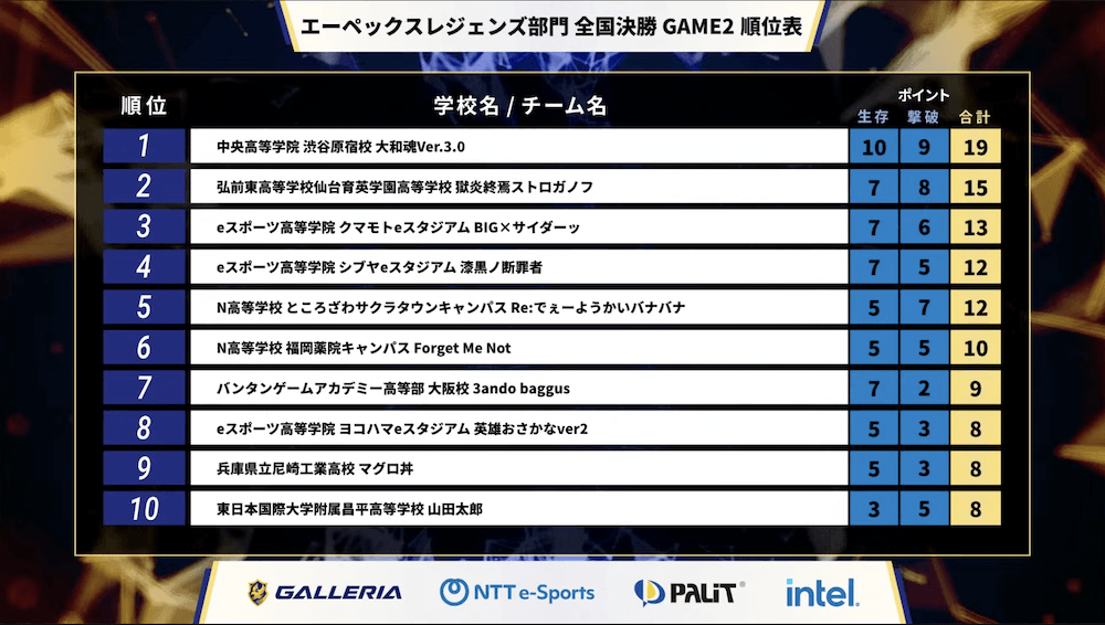 ゲーム2は、中央高等学院 渋谷原宿校「大和魂Ver.3.0」がチャンピオンを獲得。ゲーム1で首位に立ったS高は早々に全滅してしまったが、仙台育英高は2位を獲得し、総合首位に浮上した。