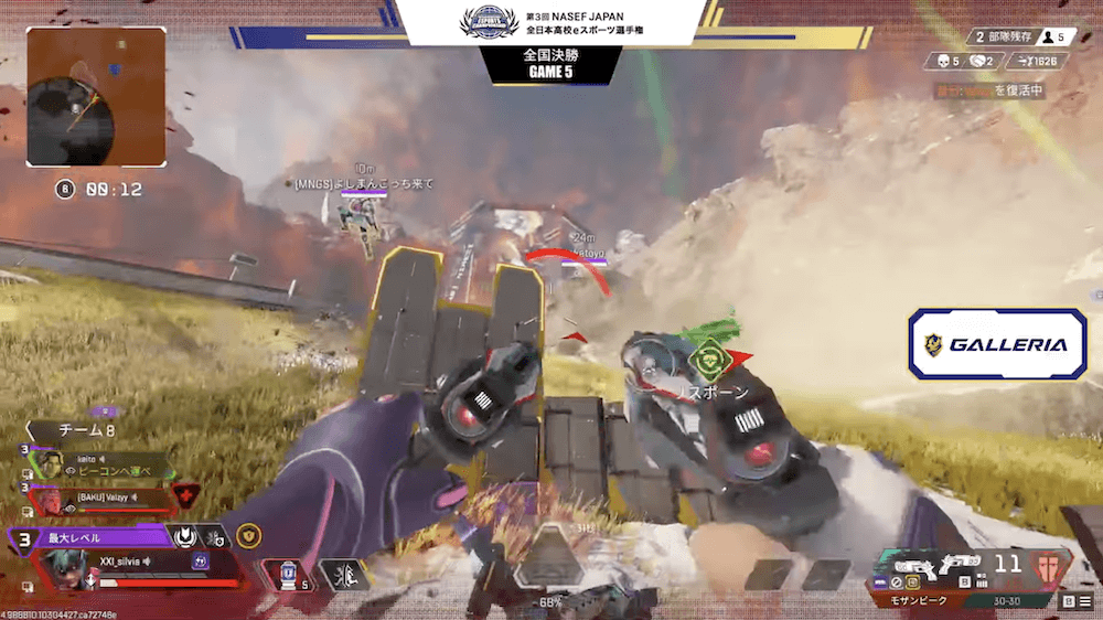 ゲーム4では、バンタンゲームアカデミー高等部 大阪校「3ando baggus」がチャンピオンを獲得したものの、eスポーツ高等学院 ヨコハマ校が2度目の首位に。再びeスポーツ学院 ヨコハマ校が1ポイント差でマップを制し、総合順位でも首位に浮上。1位と2位の間は15ポイント離れているが、上位チームは安定的な試合運びで常に上位にいるため、逆転するには30ポイント近く必要となっていた。