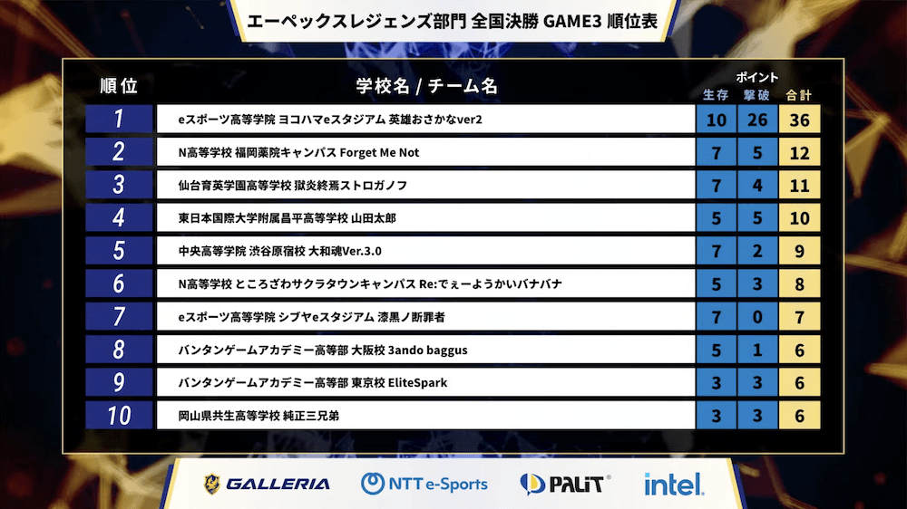 ゲーム3ではeスポーツ高等学院 ヨコハマ校が、初チャンピオン+撃破ポイントで1位を獲得。ゲーム1で1位だったS高は2連続入賞を逃し3位に下がった。