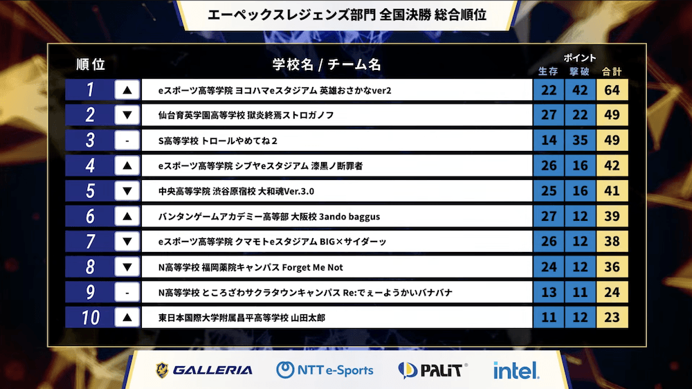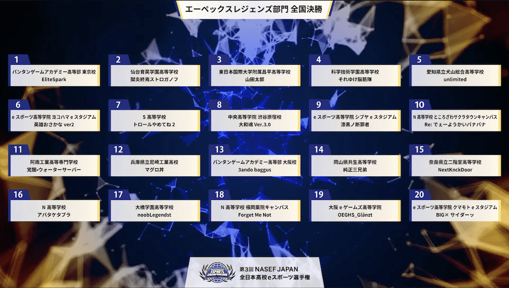 第3回 NASEF JAPAN全日本高校eスポーツ選手権 『エーペックスレジェンズ』部門 最終結果