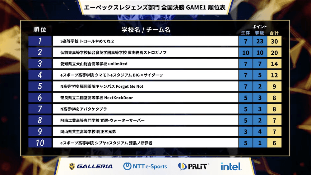 ゲーム1は仙台育英学園高等学校「獄炎終焉ストロガノフ」がチャンピオンを獲得し20ポイントを獲得したが、S高等学校「トロールやめてね2」が撃破数で上回り、総合首位に立つ。